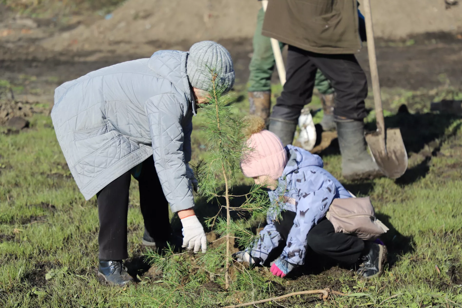 Маленькая Наташа еще говорит не всегда понятно, но уже заботливо прихлопывает грунт вокруг высаженной сосны. Говорит, что сюда пришла с бабушкой Ниной. Ничего такого и не планировали, просто шли мимо и захотели присоединиться.