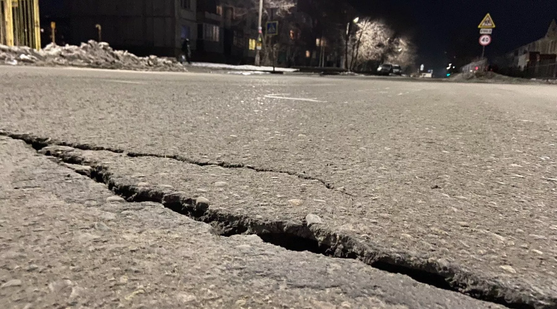 На проезжей части в районе дома №2 образовались огромные трещины, ведущие к разрушению дороги.