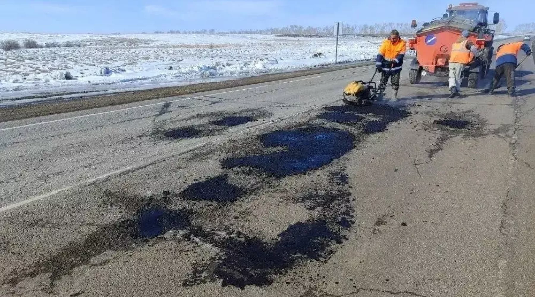 После окончания зимнего сезона дорожные службы Алтайского края приступили к ямочному ремонту. Для этих целей используется холодная асфальтобетонная смесь, позволяющая выполнять работы даже при низких температурах.