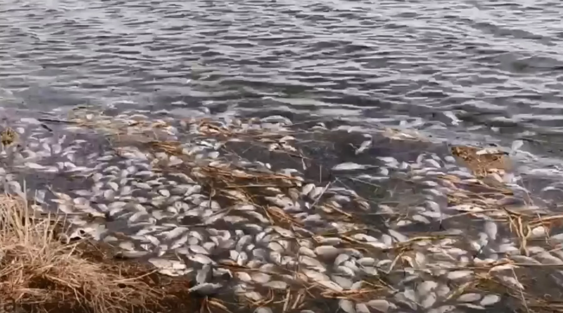 На видеокадрах, опубликованных в соцсетях, видно, что мертвую рыбу прибило к берегу водоема.
