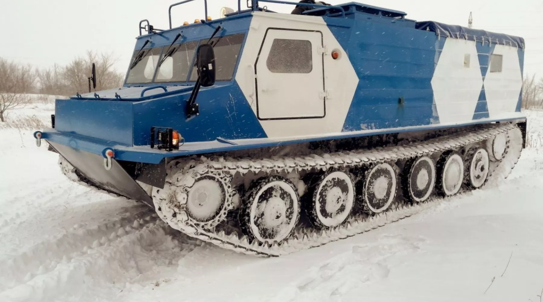 Гусеничный снегоболотоход производства ООО «Алтайтрансмаш-сервис», представляет собой быстроходную плавающую машину высокой проходимости с несущим корпусом и передними ведущими колесами. Машина предназначена для перевозки людей и различных грузов по бездорожью в условиях заснеженной целины и лесисто-болотистой местности при температурах воздуха от -45 до +45 градусов.