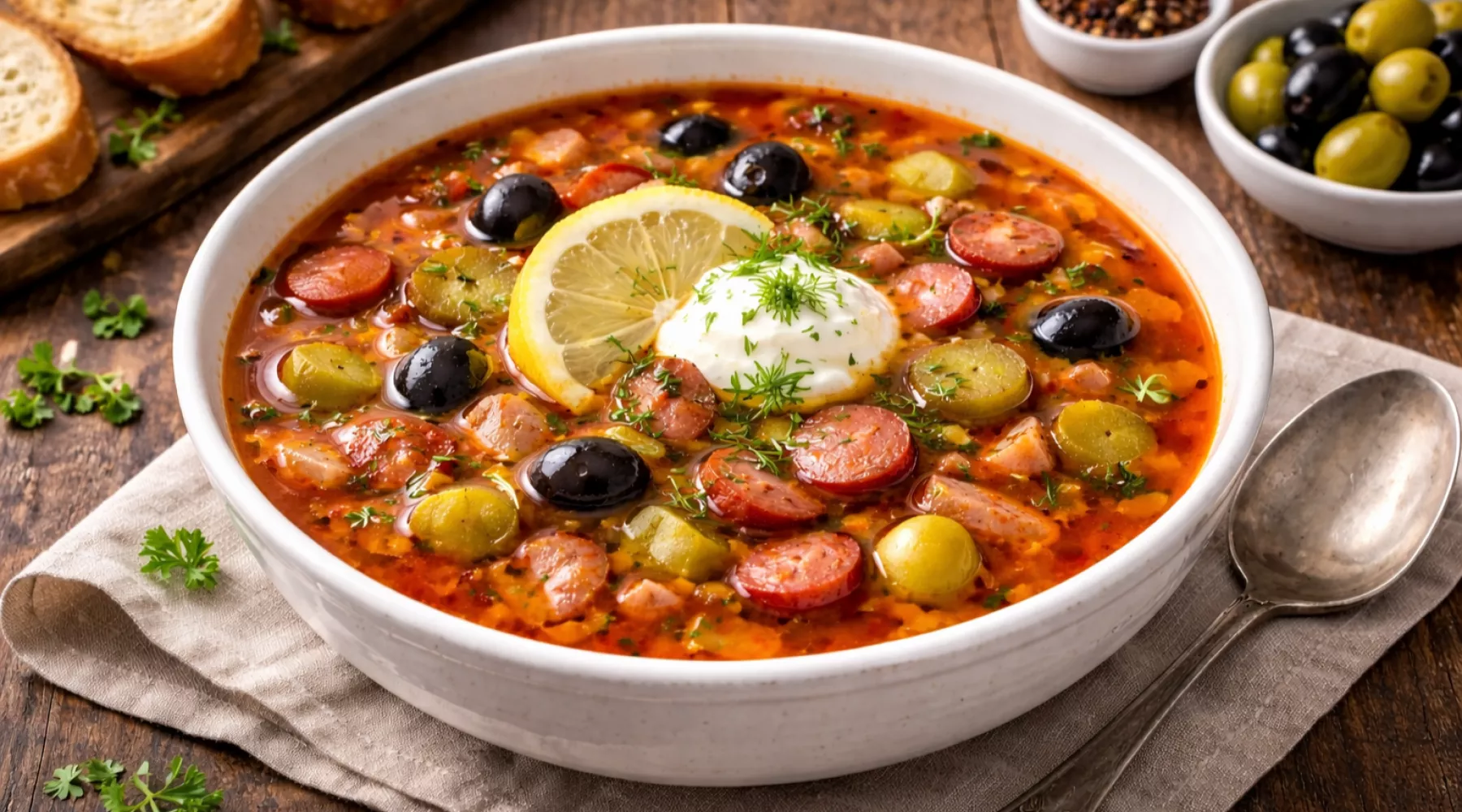 Солянка — это не просто суп, а настоящее событие в тарелке. Густой, наваристый, с яркой кисло-солёно-острой палитрой, он создан для того, чтобы согревать, насыщать и возвращать к жизни. Это блюдо с характером: оно требует внимания к деталям, но щедро вознаграждает за труды. Идеальная солянка — это симфония из трёх видов мяса, оливок, каперсов и лимона, где каждый ингредиент ведёт свою партию, создавая незабываемый насыщенный вкус.