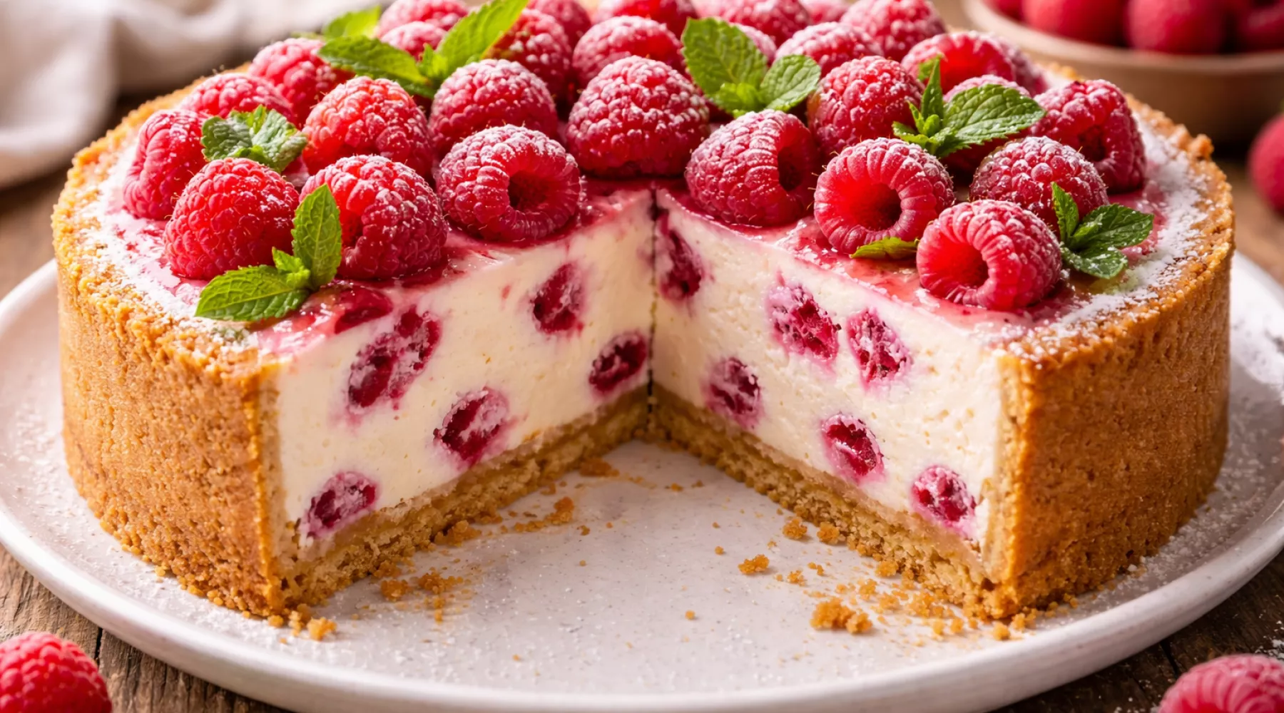 Творожный пирог с малиной — это идеальный союз нежной, кремовой начинки и свежей ягодной кислинки. Он похож на чизкейк, но готовится проще, быстрее и обходится гораздо дешевле. Мягкая творожная масса буквально тает во рту, а яркие ягоды малины добавляют летнюю свежесть и красивый контраст. Этот пирог одинаково хорош для семейного чаепития, детского праздника или уютного вечера с чашкой кофе. Даже те, кто не любит творог, не устоят перед этим десертом — начинка получается настолько нежной, что напоминает суфле.