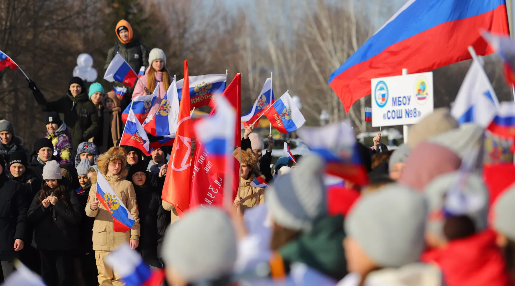 Юнармейцы, участники Движения Первых, хор кадетской школы и воспитанники Дома детского творчества подготовили небольшую концертную программу. Ребята читали стихи и исполняли патриотические песни.