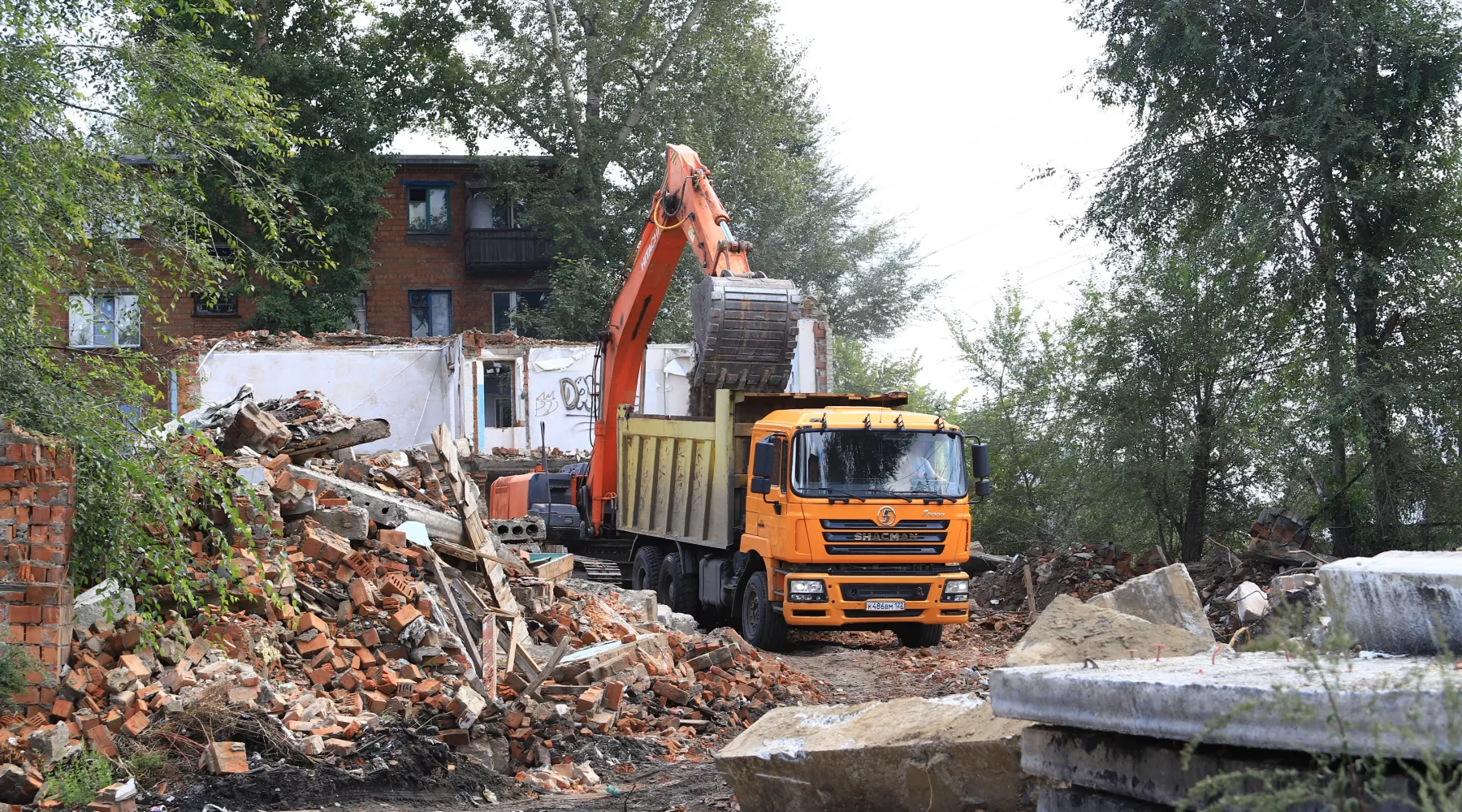 Поддерживая рвение бийчан убрать "с глаз долой" многолетние развалы, подрядчик взялся за работу. Только за первый день была проведена полная подготовка к демонтажу половых плит и очистка от мусора. На следующий уже начали разбирать с помощью крана верхние площадки и освобождать от завалов подходы и подъезды к дому. Если на начальном этапе активно использовалась малая спецтехника (мини-экскаватор для работ на крыше) и ручной труд, то на последних - более серьезные машины: экскаваторы, краны, грузовики для вывоза строительного мусора.