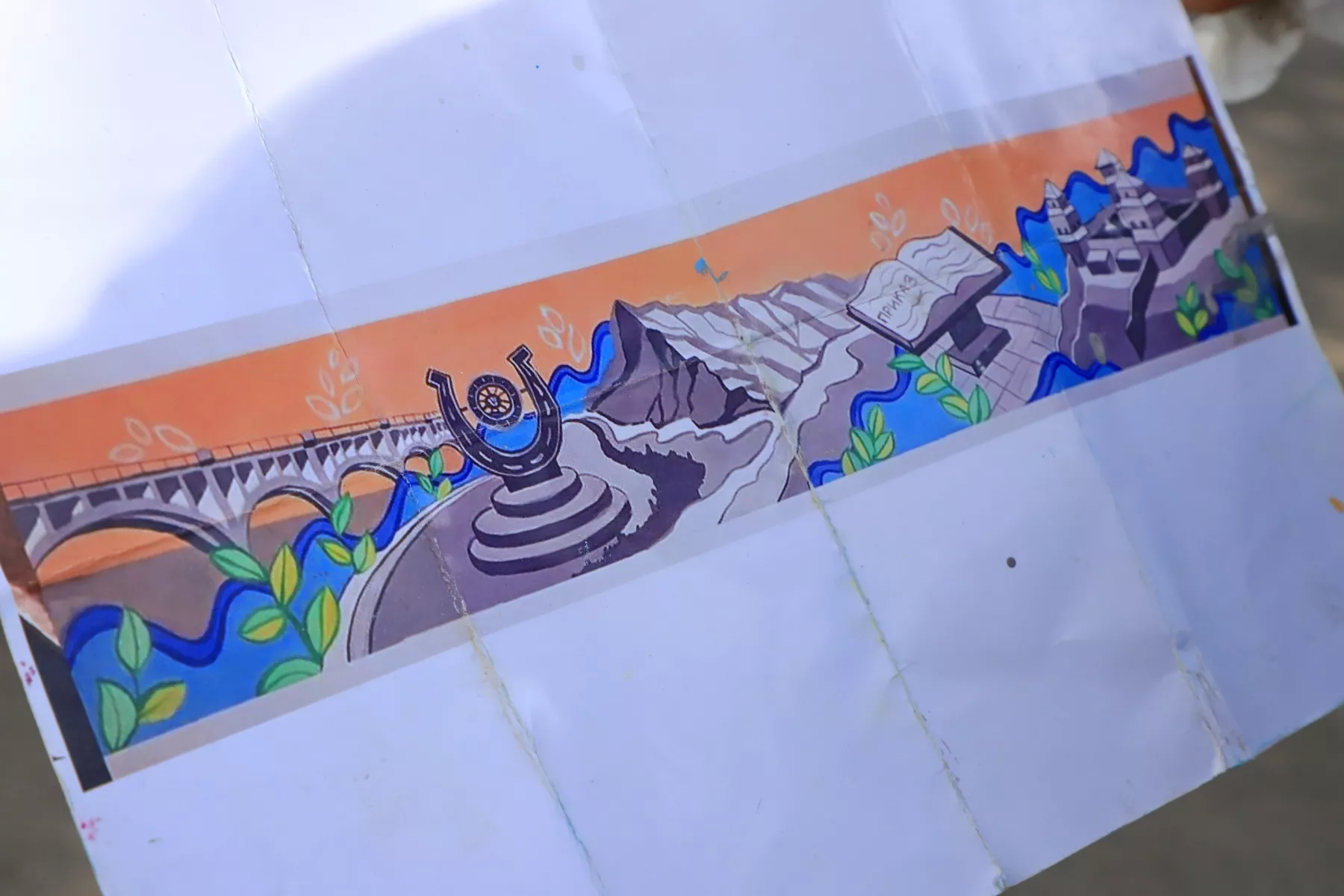 Сейчас уже изображено несколько объектов: бийская крепость, горы и знак нулевого километра. Рядом сделан набросок коммунального моста.