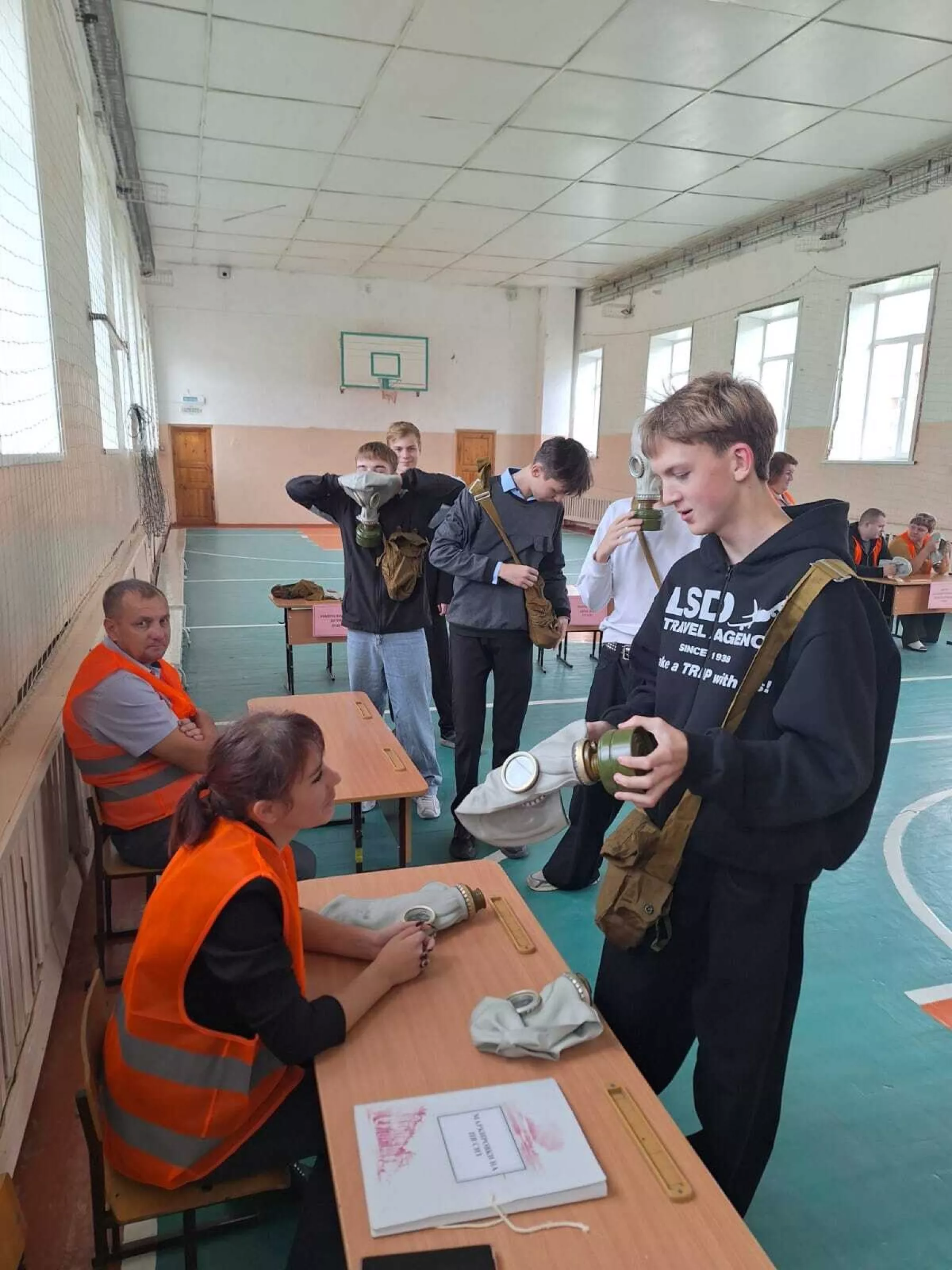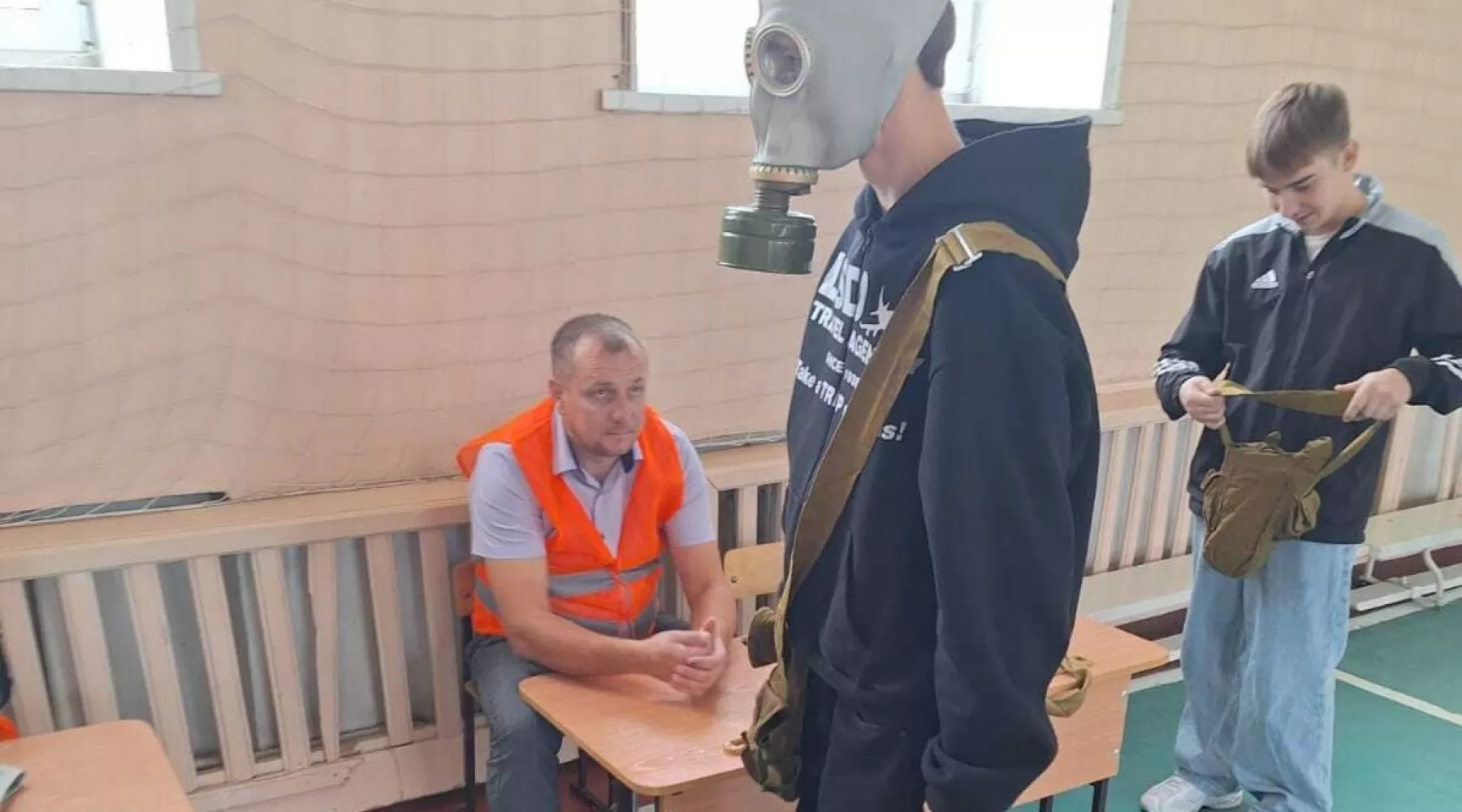 Одним из мероприятий тренировки стали практические учения на базе школы. В тренировке участвовали старшеклассники, они получили индивидуальные средства защиты и отработали действия при ЧС.