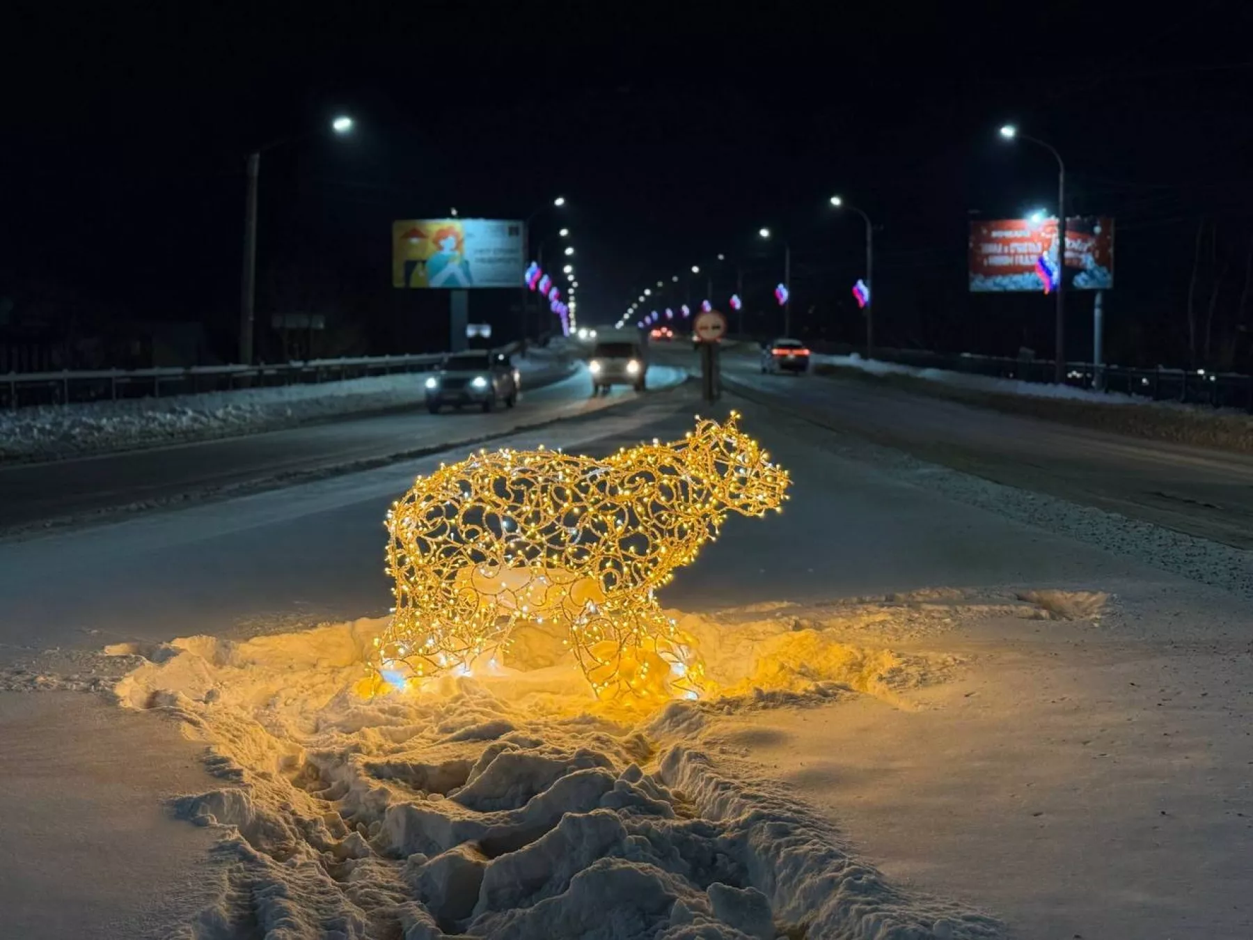 Как ранее писал «БР», декорации – медведь и деревья – сделаны из металлического каркаса, с золотыми светодиодными гирляндами. Арка-шар – металлоконструкция со светодиодной подсветкой, представляет из себя новогодний шарик, через который можно ходить, использовать для фотосессий.