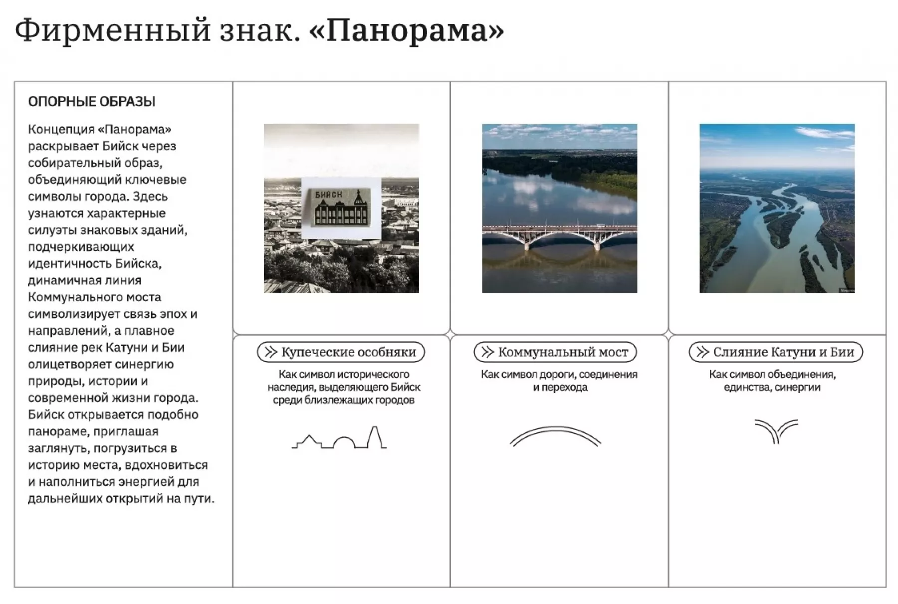 В брендбуке постарались отразить уникальность города, которая легла в основу слогана: Бийск – на пути открытий. Открывать здесь можно и новые дороги – на Алтай, и наследие – нашу архитектуру и памятные объекты, и культуру, и события…