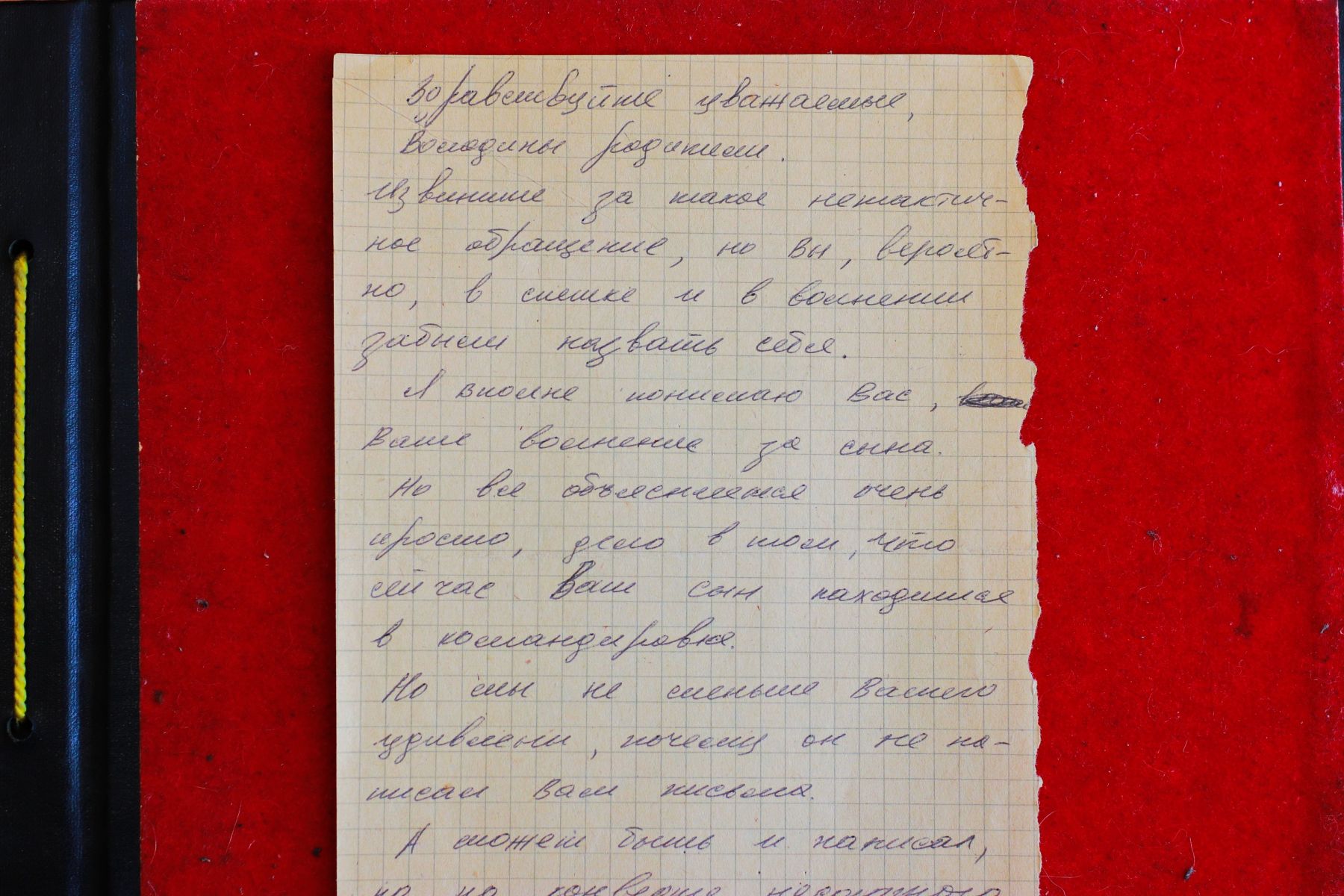 «Почему от вас нет писем уже больше двух недель? У нас появился молодой, вместо Мишки. Сейчас тоже учится, вникает. Стало холодно, постоянно туманы. Хорошо, что батареи постоянно топят. Мамуля, напиши, где теперь работаешь? Как у вас насчет снега? Здесь его вообще нет». (…)