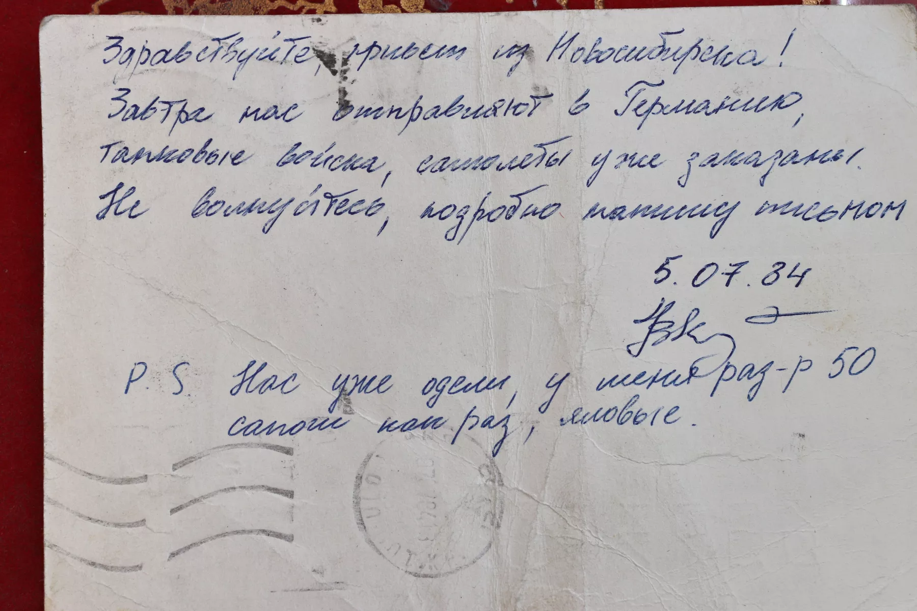 «Самолетами нас не отправили, опоздали заказчики. Едем поездом Новосибирск-Москва, потом Брест-ГДР. Дали по 7 рублей на 5 суток. В Новосибирске нас одели, выдали всем яловые сапоги, шинель, китель. Еду со своими. А вообще, набрали со всей Сибири. Деньги в конвертах не высылайте, они не дойдут».