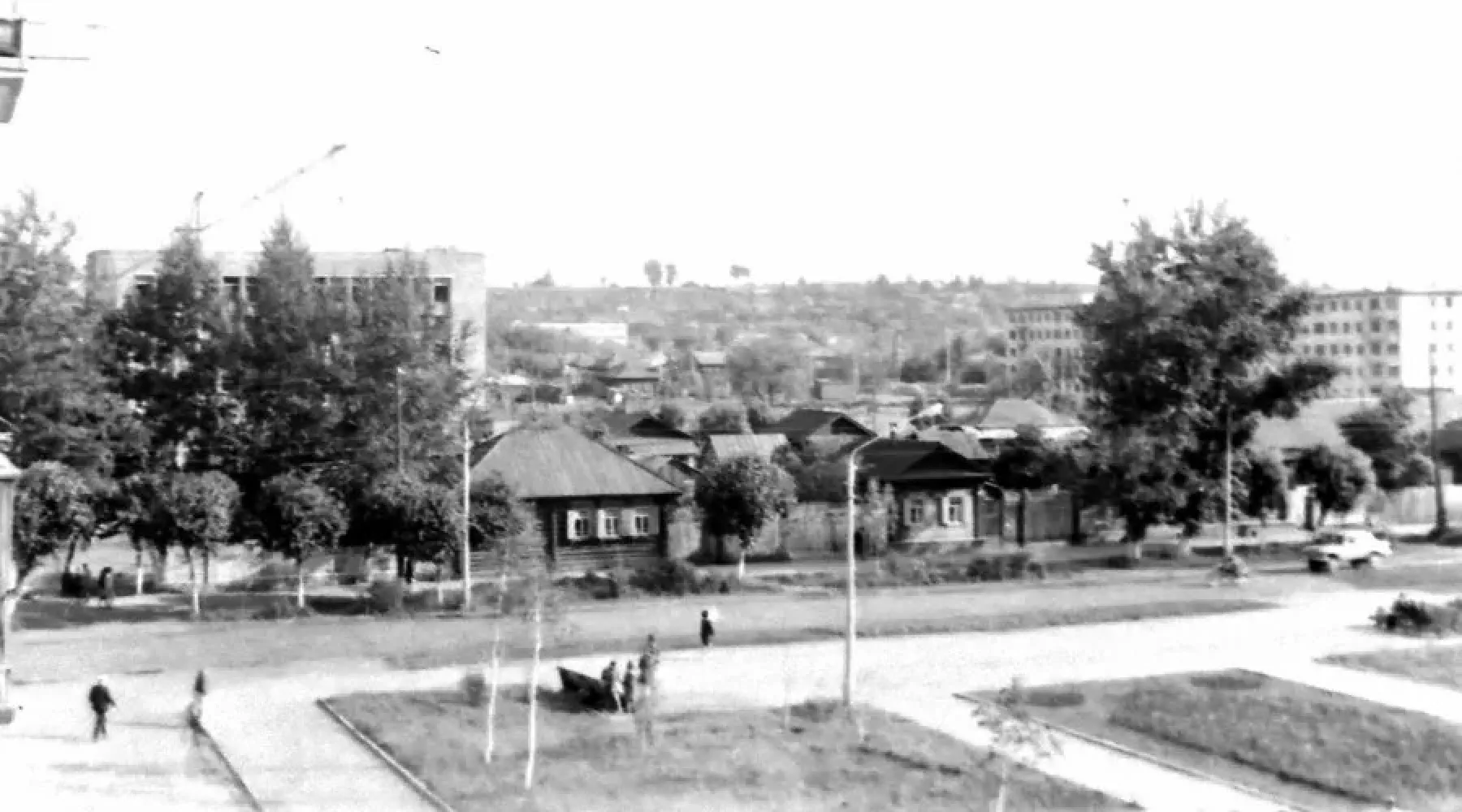 А вот еще одно интересное фото – на нем из-за деревьев не видно здания администрации города, а на Петровском бульваре – избы. Это фото было сделано с балкона дома № 71 по улице Краснорамейской.