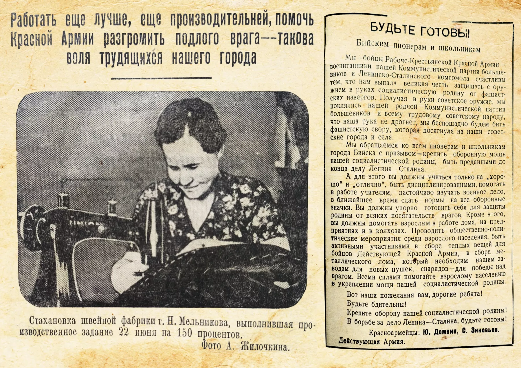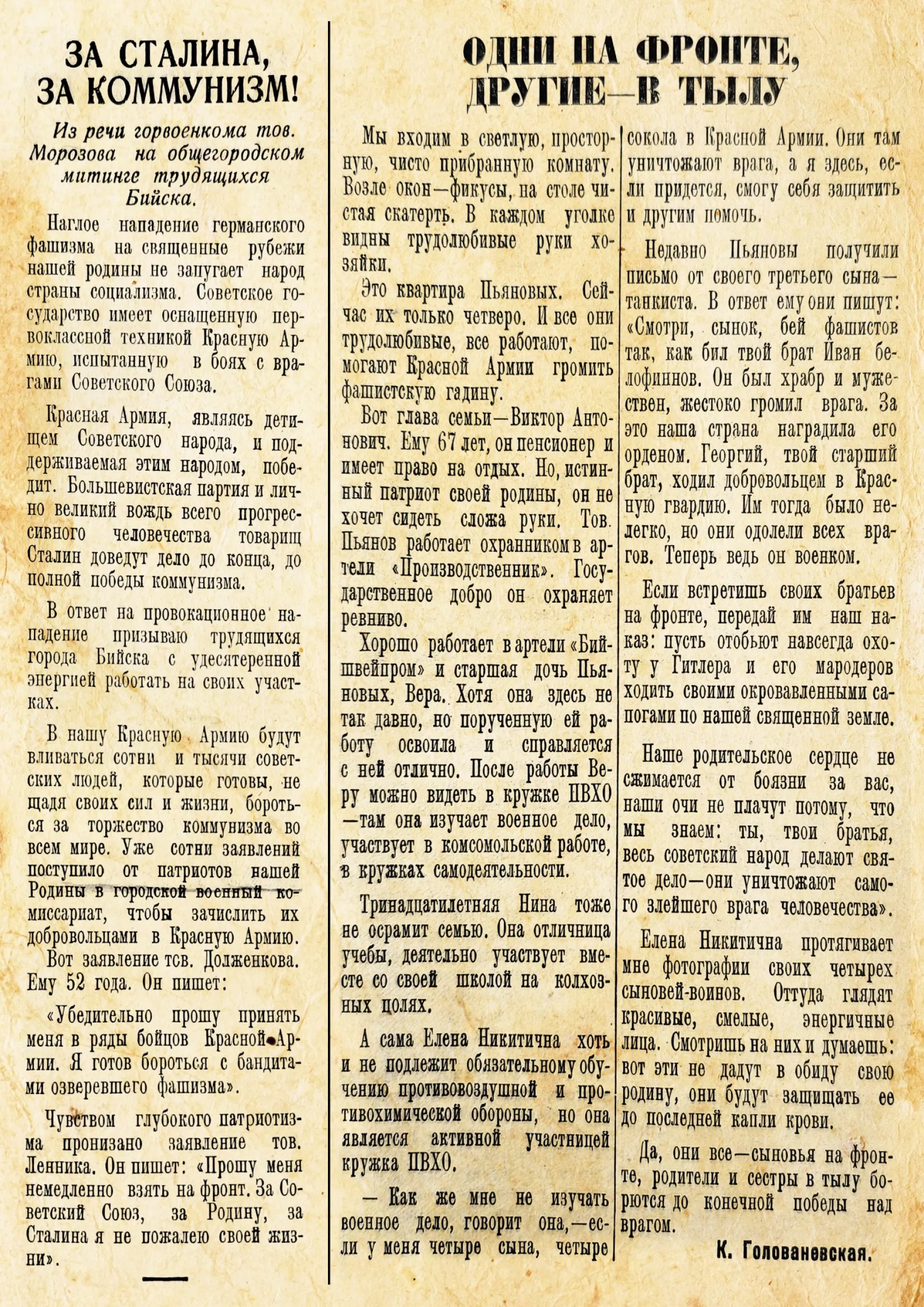 Война коснулась почти каждой семьи. Вот рассказ о семье Пьяновых. Их четыре сына – в Красной Армии. Их мать здесь, в Бийске, стала активной участницей кружка по обучению противовоздушной и противохимической обороне. Глава семьи работает охранником в артели «Производственник». Старшая дочь занимается швейным делом, младшая, 13-летняя, - работает со своей школой на колхозных полях.