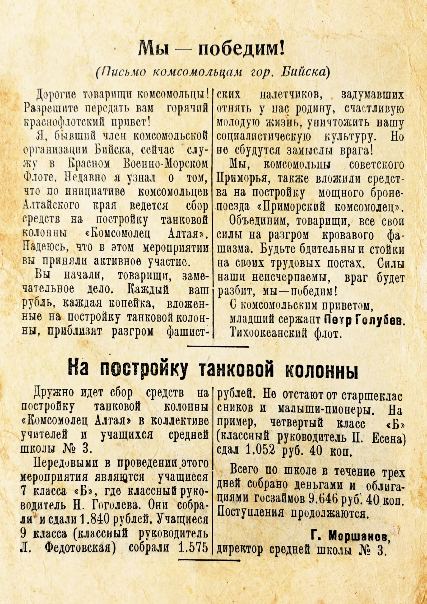 Здесь же – призыв к бийским пионерам от красноармейцев: учиться на хорошо и отлично, крепить оборонную мощь родины, активно собирать теплые вещи для красноармейцев, металлический лом.