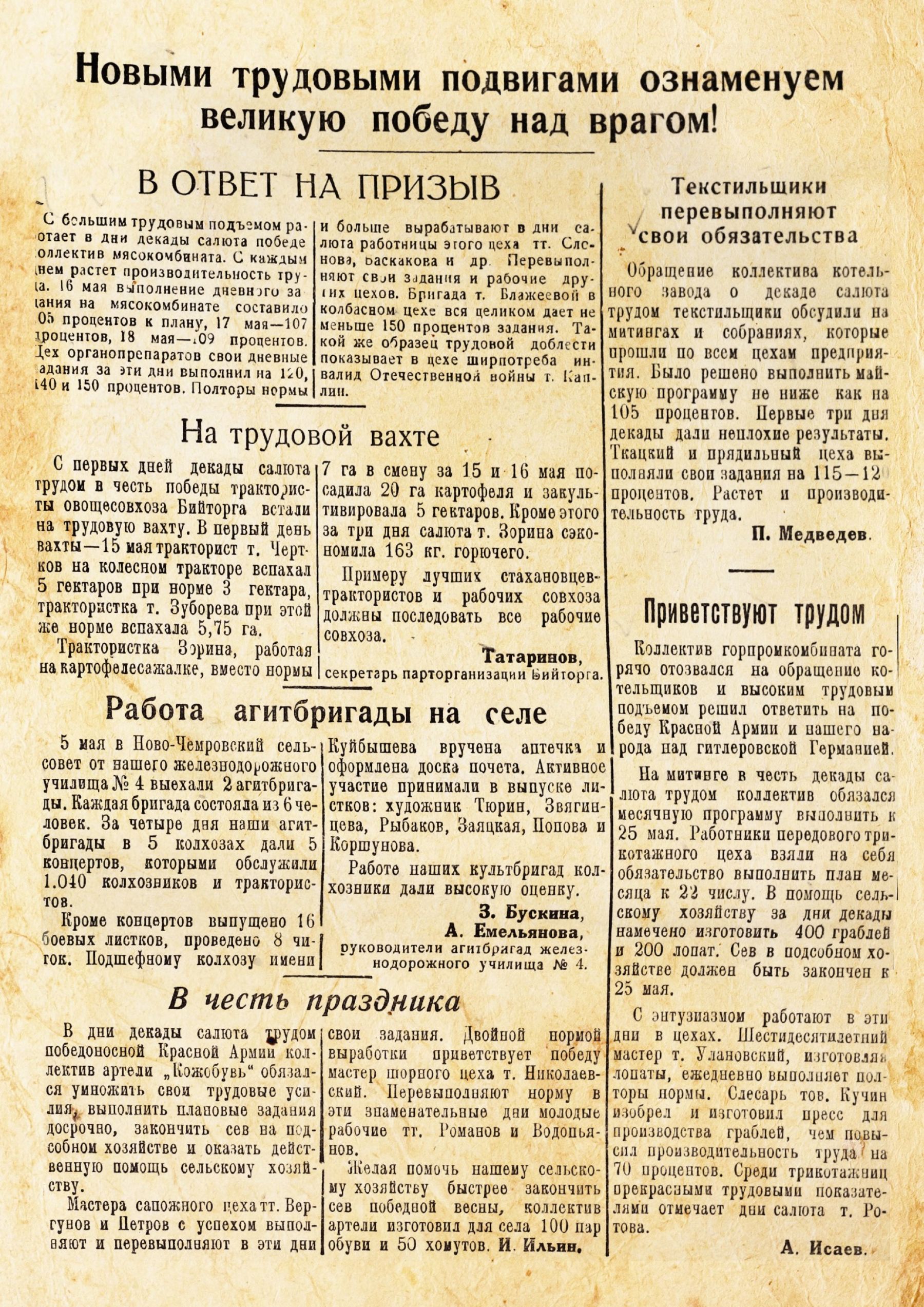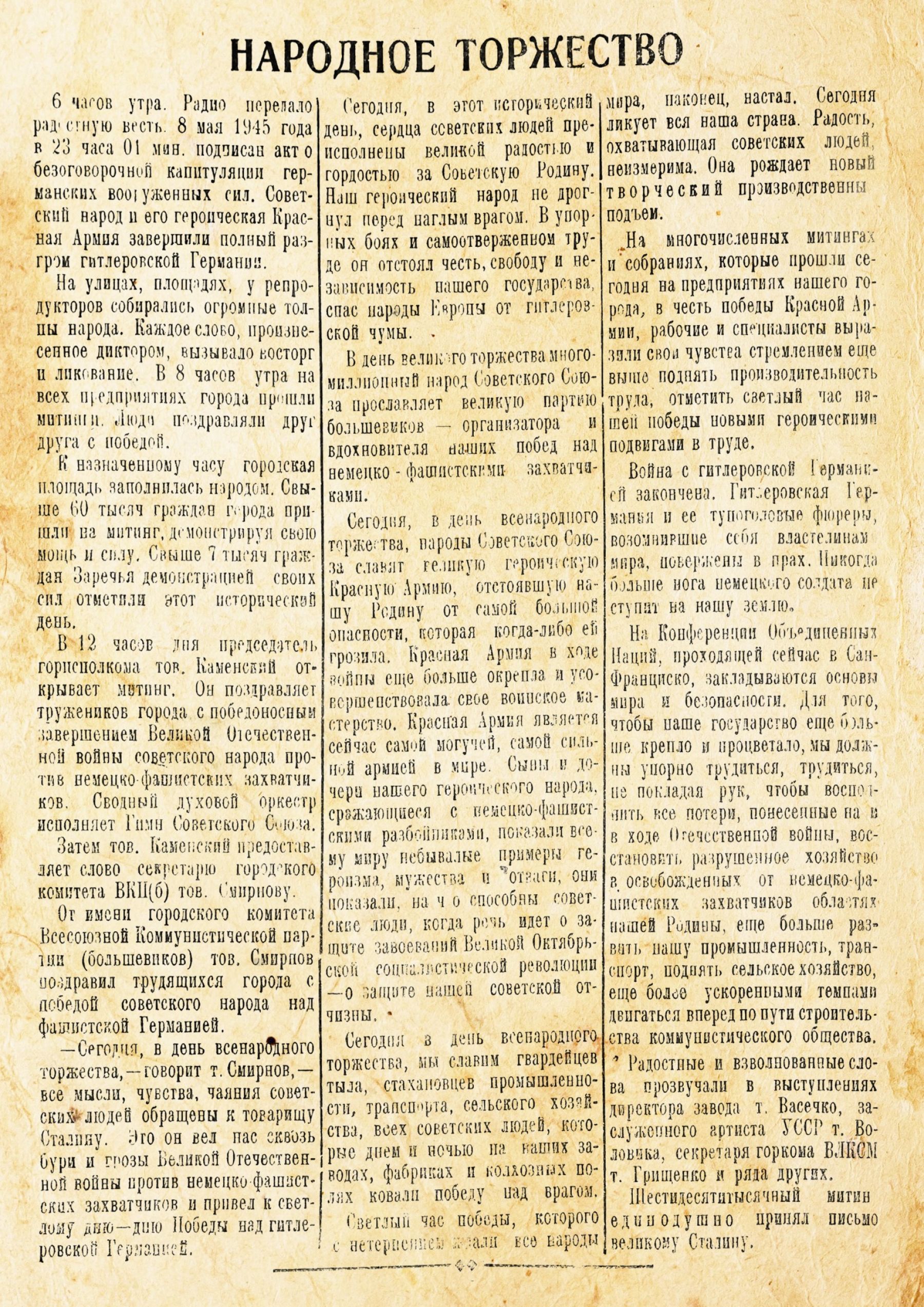 Победа 1945 года стала общим праздником. На городской площади собирается 60-тысячный митинг. В честь победы объявляют декаду салюта трудом.