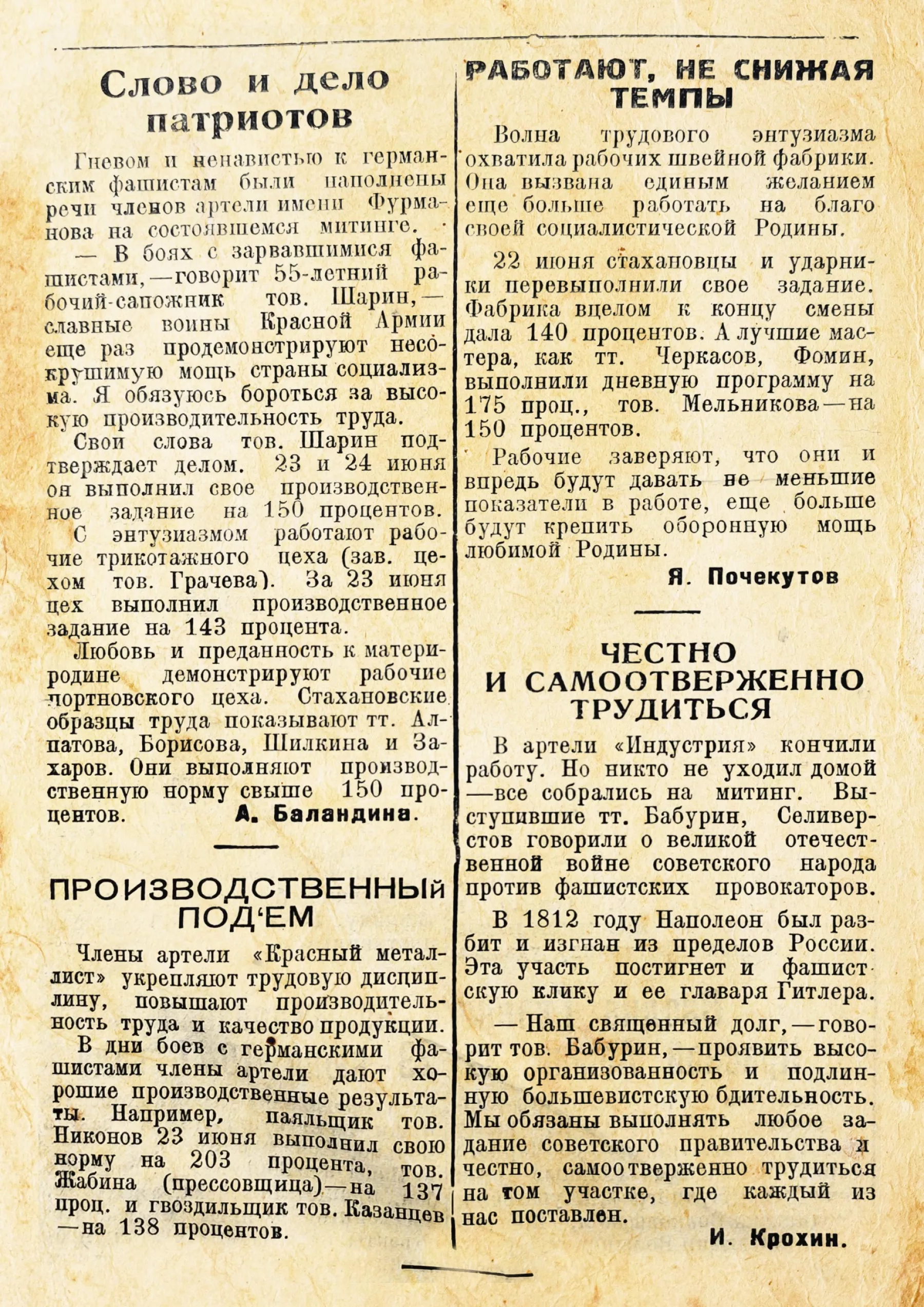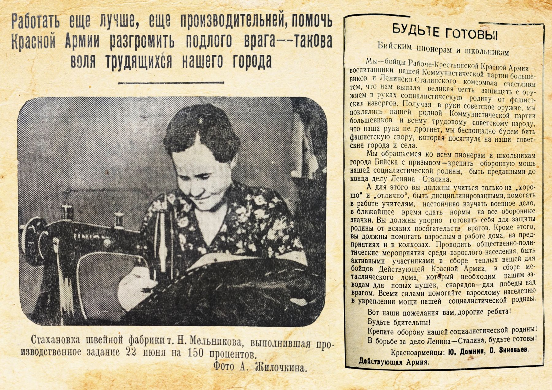 «Работать еще лучше, еще производительнее, помочь Красной Армии разгромить подлого врага – такова воля трудящихся нашего города», - под таким лозунгом в первые дни войны выходит портрет стахановки Н. Мельниковой, рабочей швейной фабрики, которая 22 июня 1941 года, узнав о нападении на Советский Союз, выполнила план на 150 процентов.