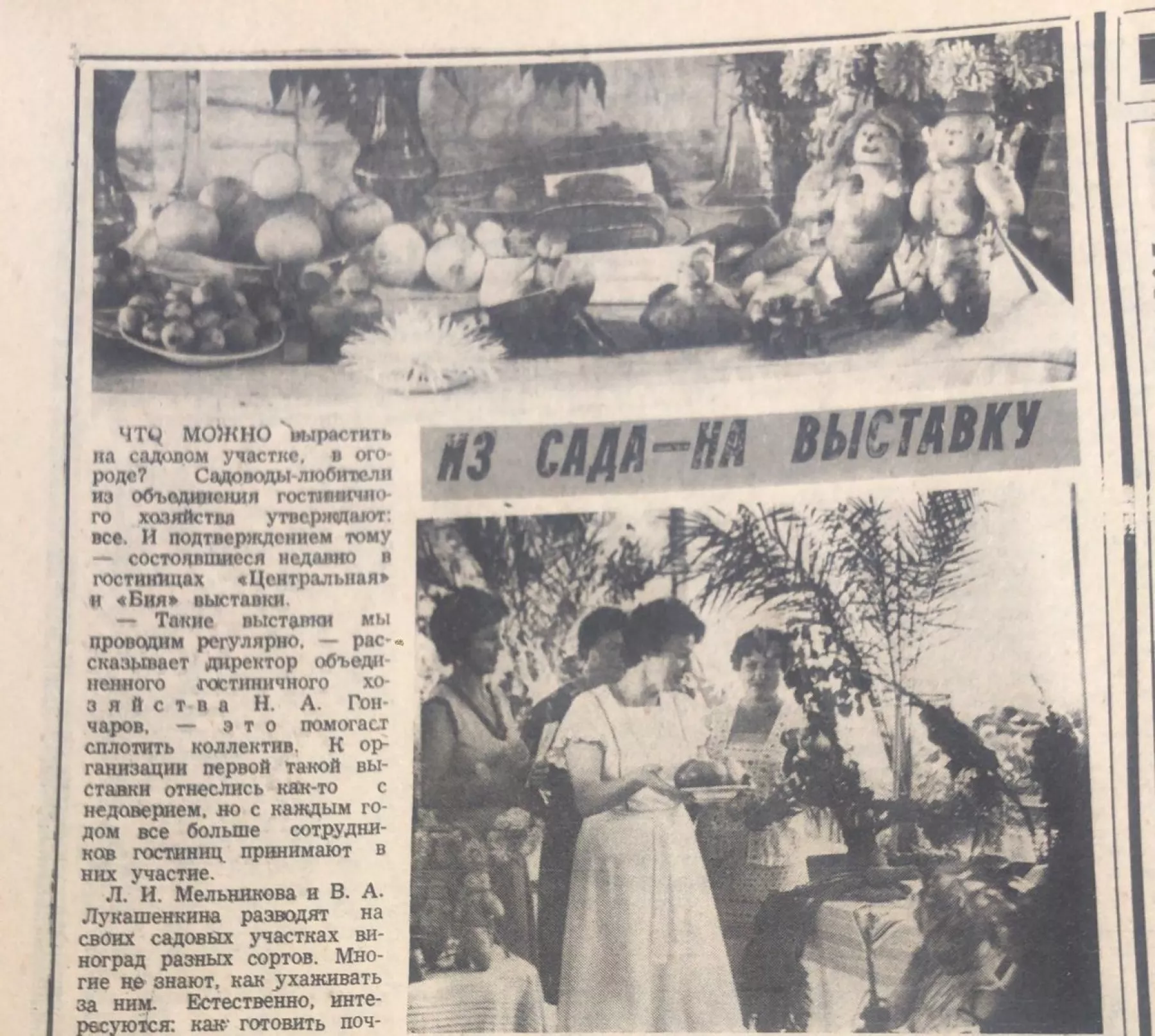 «Л. И. Мельникова и В. А. Лукашенкина разводят на своих участках виноград разных сортов… На столах можно найти и различные сорта яблок, груш, слив, ягодных культур. Один стол занимает урожай швеи гостиницы «Центральная» Е. Н. Беляевой. В своем огороде, кроме привычных помидоров и огурцов, Евдокия Николаевна экспериментирует с теплолюбивыми растениями. Дыни, арбузы, сладкий перец по величине и вкусовым качествам не уступают привезенным из южных республик».