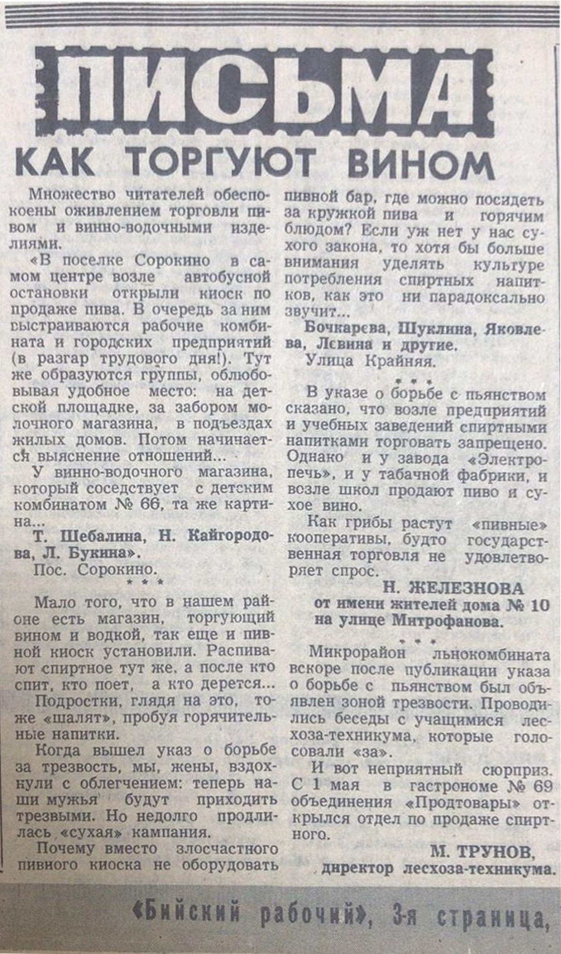 «Когда вышел указ о борьбе за трезвость, мы, жены, вздохнули с облегчением: теперь наши мужья будут приходить трезвыми. Но недолго продлилась «сухая» кампания. Почему вместо злосчастного пивного киоска не оборудовать пивной бар, где можно посидеть за кружкой пива и горячим блюдом? Если уж нет у нас сухого закона, то хотя бы больше внимания уделяли культуре потребления спиртных напитков, как это ни парадоксально звучит…»