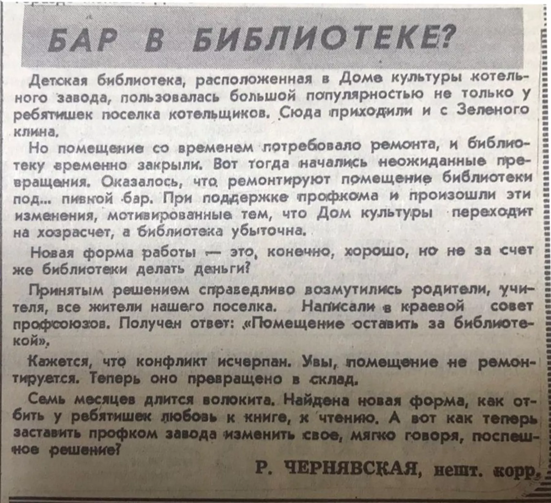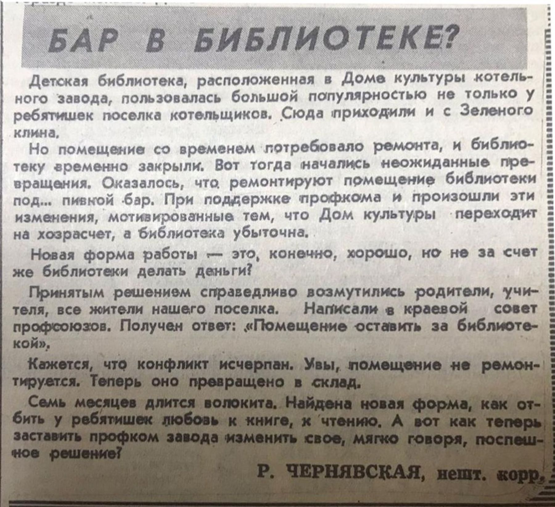 «…начались неожиданные превращения. Оказалось, что ремонтируют помещение библиотеки под… пивной бар. При поддержке профкома и произошли эти изменения, мотивированные тем, что Дом культуры переходит на хозрасчет, а библиотека убыточна».