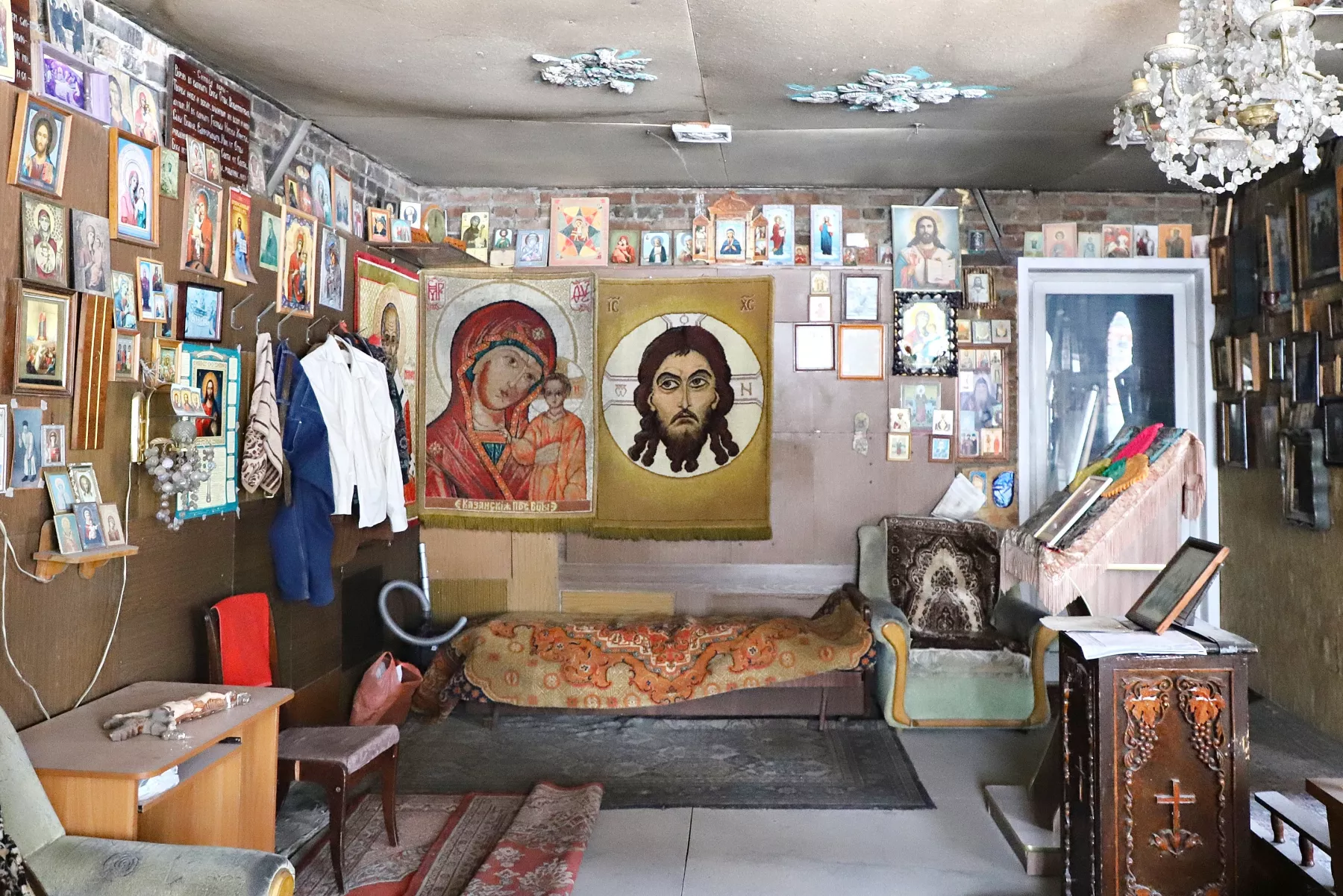 Начало положено: братья построили молитвенную комнату, на стенах в помещении множество икон и фотография царской семьи.