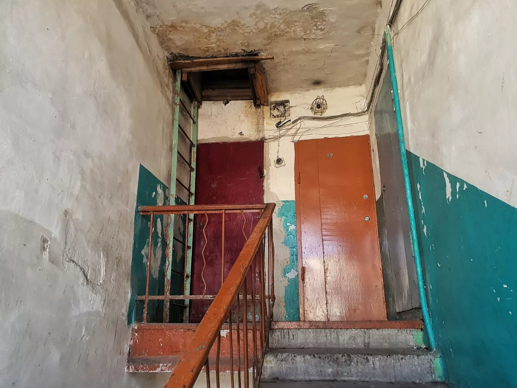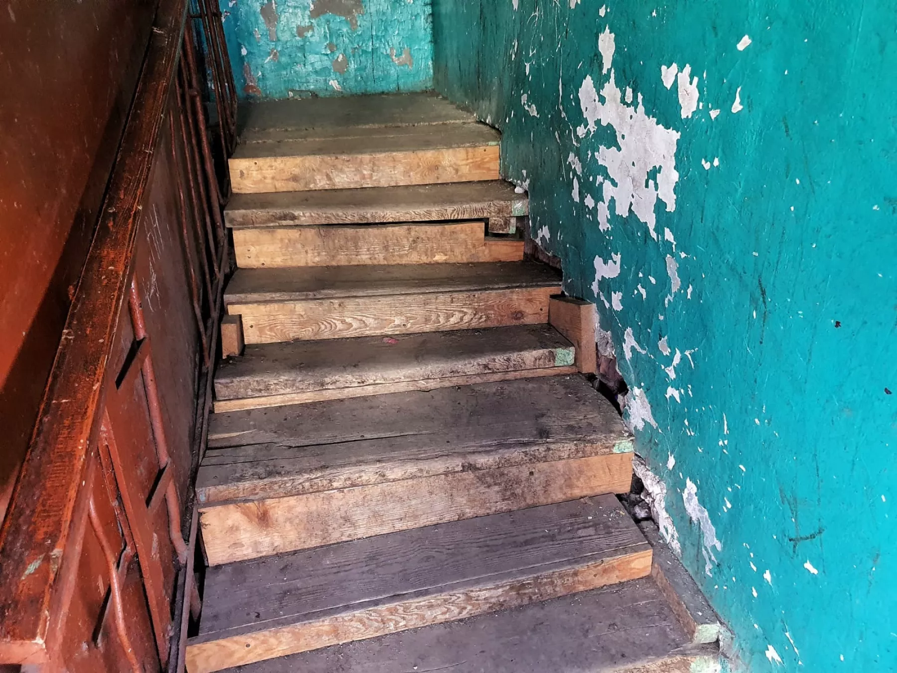 Уже в подъезде от окружающей обстановки захватывает дух: лестница разрушена, где-то ее уже заменили на деревянные доски.