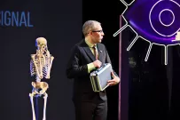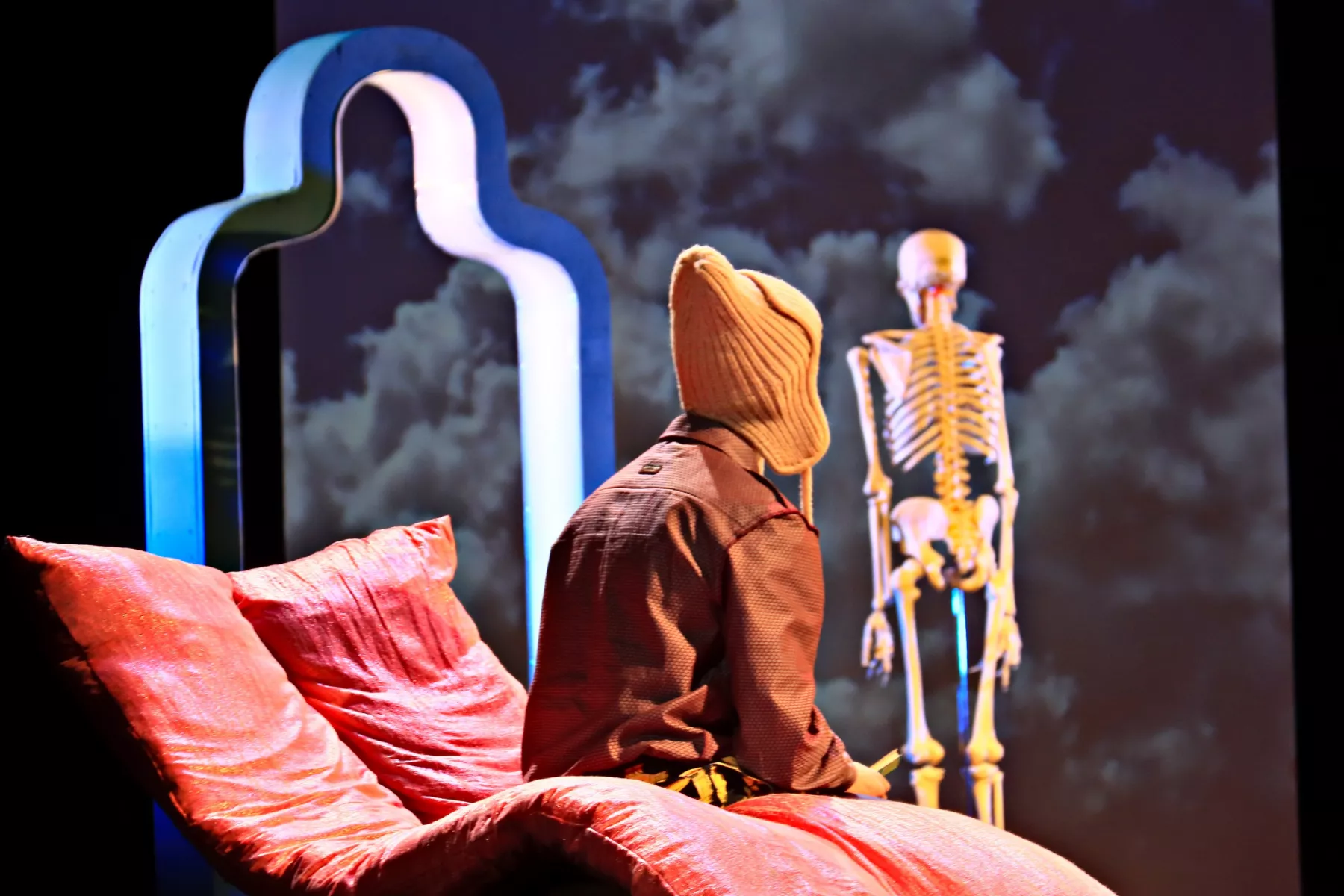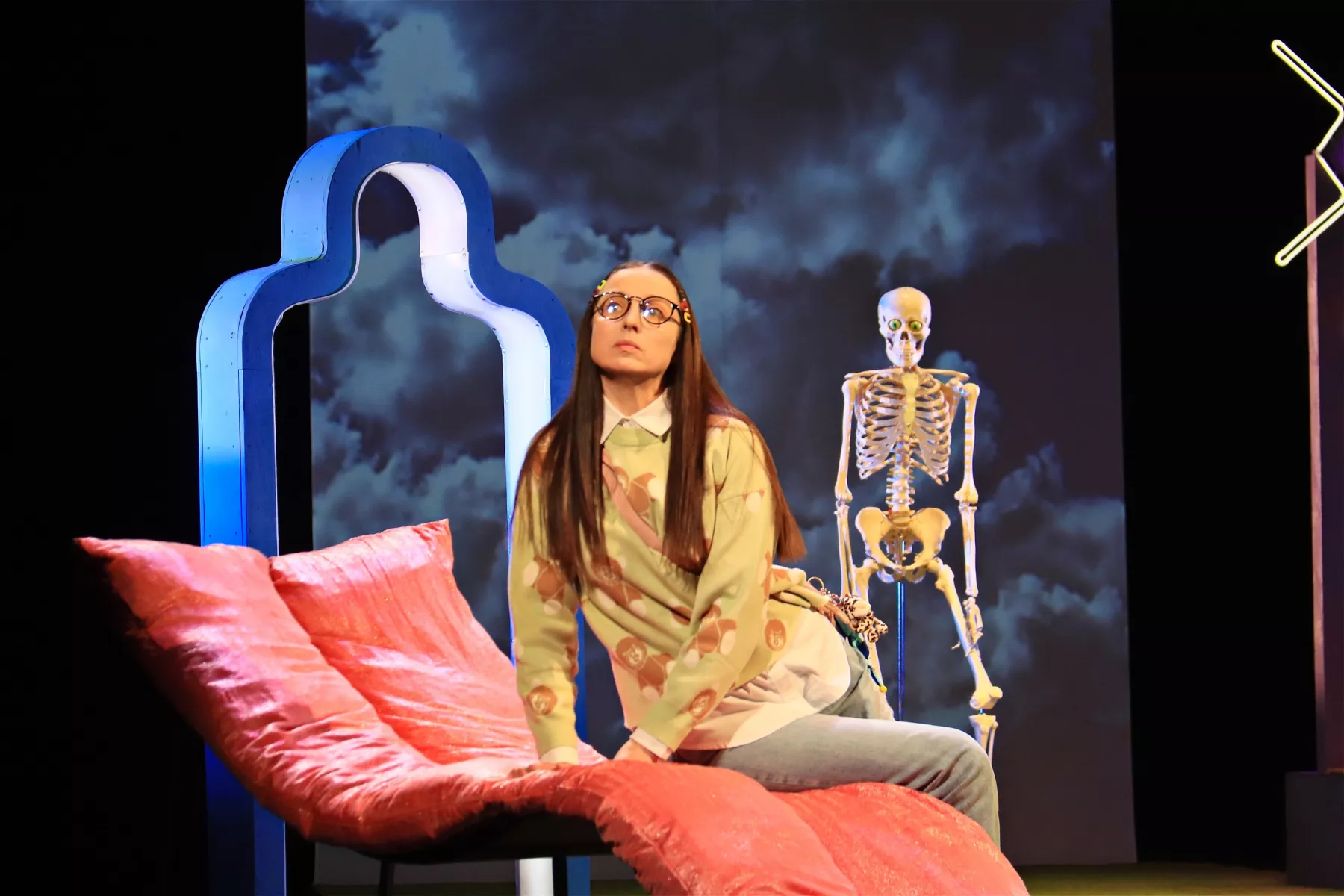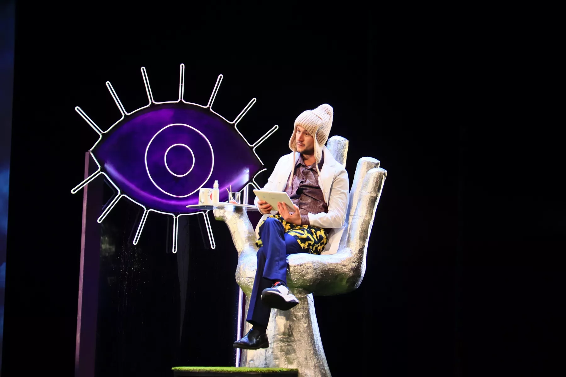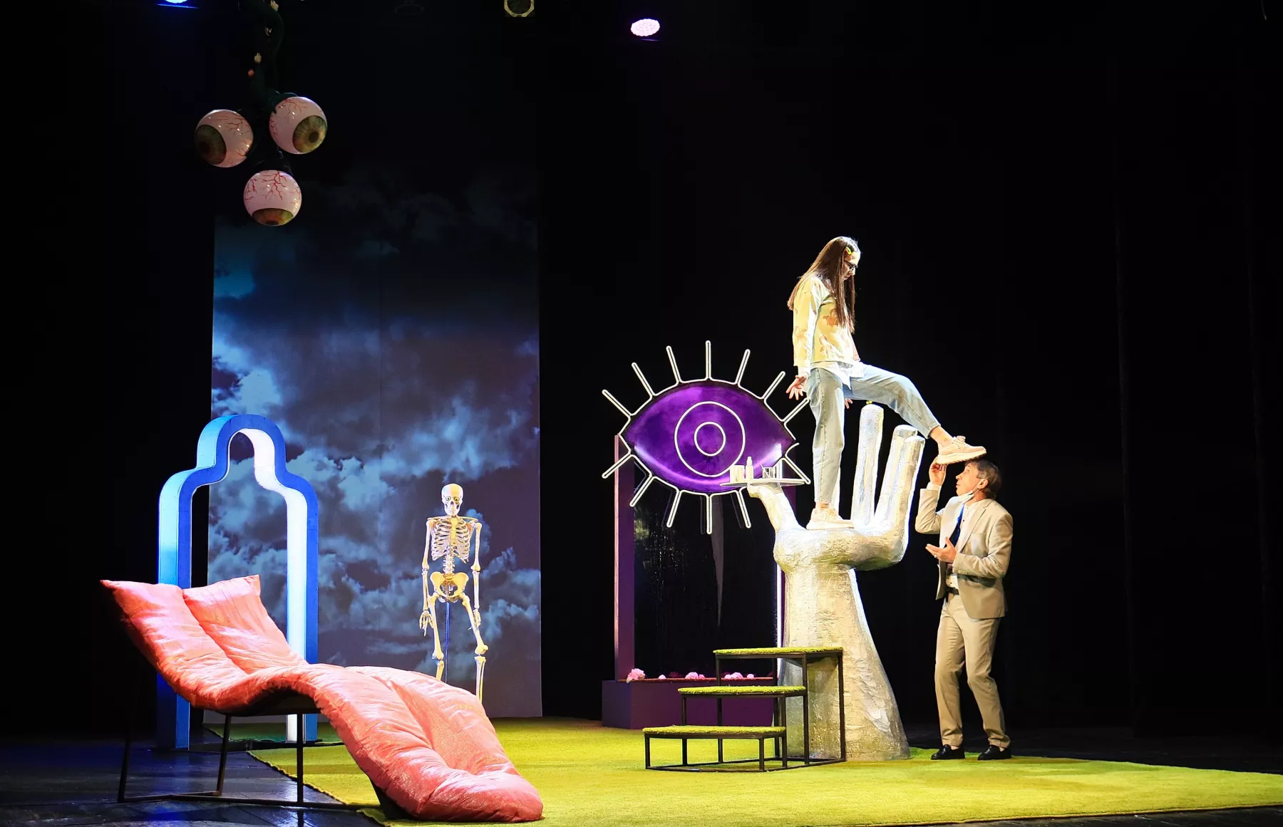 На сцене зритель видит светящиеся вывески: мозг, глаз, лампы-глаза, у импровизированного лифта стоит скелет. Психиатр восседает на большой ладони, а пациент, Владимир Гапеев в роли Михаила, который по сюжету страдает потерей памяти, в нелепой одежде (разные ботинки, шорты, шапка-ушанка) приходит к нему на прием, устраивается на кресле-языке.
