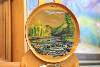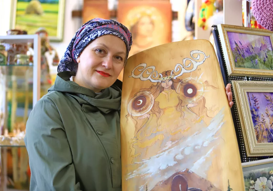 – Сначала я смотрю на поверхность дерева и его природный рисунок, потом начинаю добавлять в него краски. За счет этого рождаются интересные сюжеты, в основе которых – Алтай и его природа, мифология, сказки, бытовые сцены и эпизоды взаимодействия человека с природой, – делится Вера Сергеевна. – Чаще всего оставляю рисунок дерева видимым. Как говорят люди, именно такие работы заряжают их позитивом и дают энергию. Еще работаю с кожей – создаю на ней небольшие иллюстративные панно. Пожалуй, это один из востребованных сувениров.