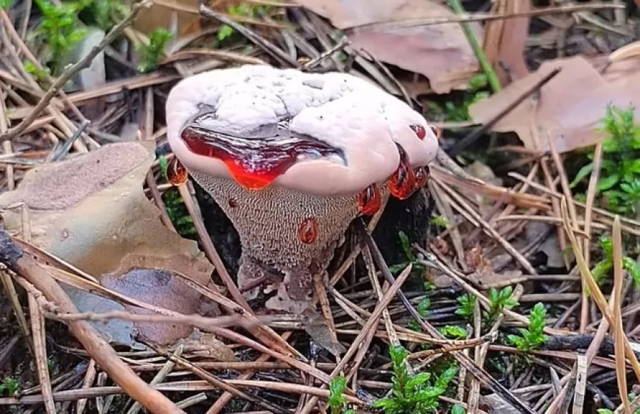 Гриб гиднеллум пека всегда производит фурор - вид у него такой, что кажется, из раздавленного гриба течет варенье. Сразу ясно - ядовитый. Растет он возле хвойных растений.