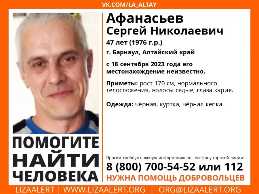 В Барнауле разыскивают пропавшего 47-летнего Сергея Афанасьева, который пропал с 18 сентября, сообщает поисковый отряд "ЛизаАлерт".