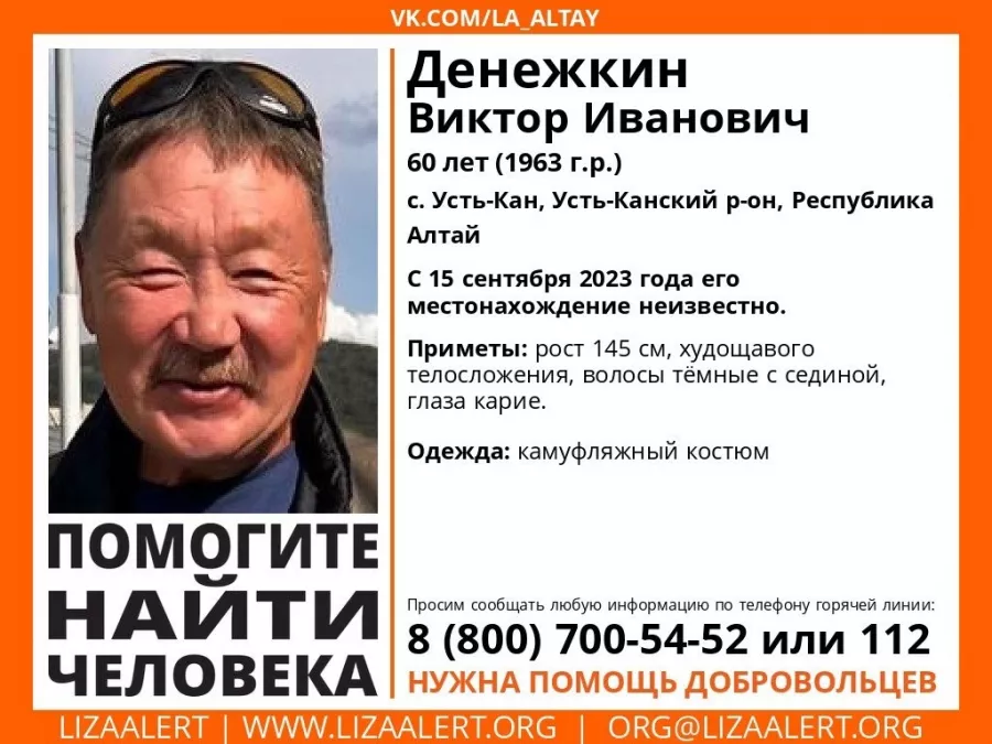 Особые приметы: рост 145 см, худощавое телосложение, волосы темные с сединой, глаза карие. В день исчезновения Виктор Денежкин был одет в камуфляжный костюм.