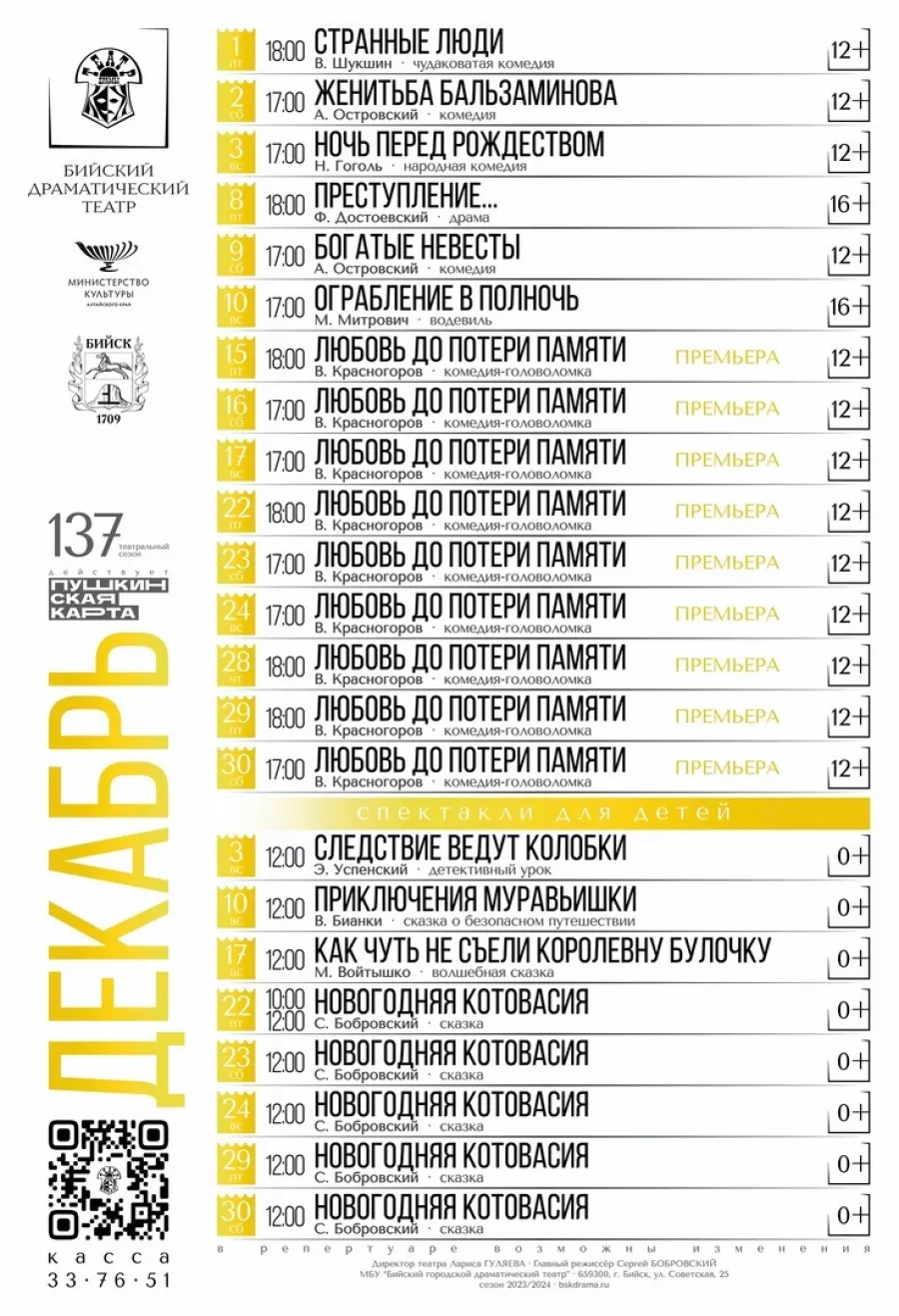 Бийский драматический театр представил афишу спектаклей, которые горожане и гости города могут посетить в последнем месяце уходящего 2023 года.