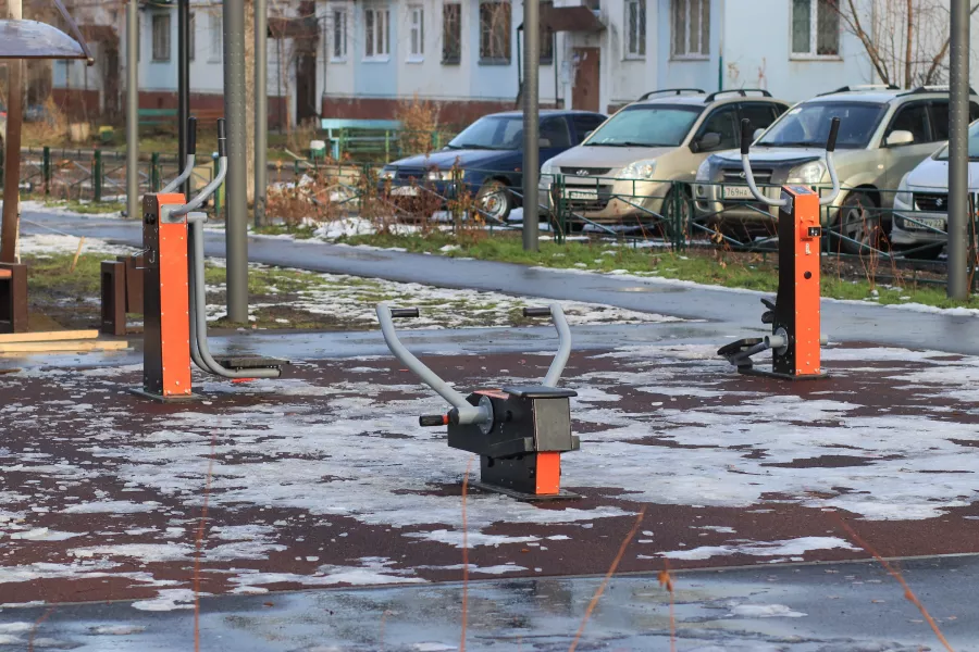 В сквере, помимо детской площадки, определена спортивная зона. Пользоваться тренажерами можно даже в холодное время года - у них пластмассовые ручки.