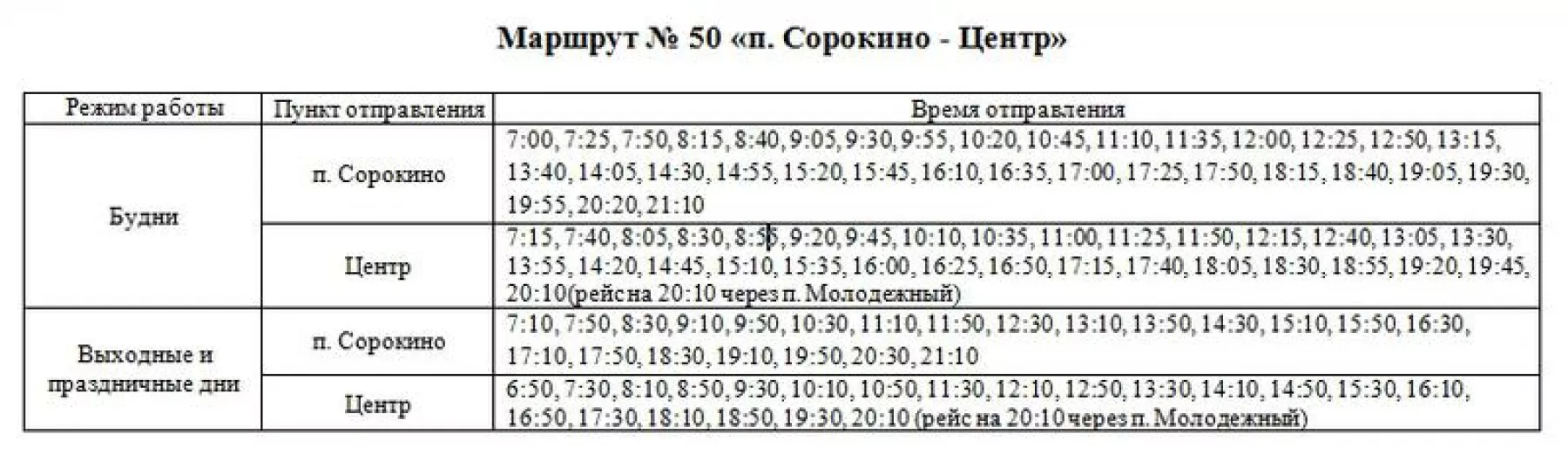 «Уважаемые пассажиры! С 1 февраля 2019 года будет изменено расписание движения маршрута № 50 «п. Сорокино - Центр» («Газели»). Интервал движения в будни составит 25 минут, в выходные и праздничные дни расписание останется без изменений», - говорится в сообщении.