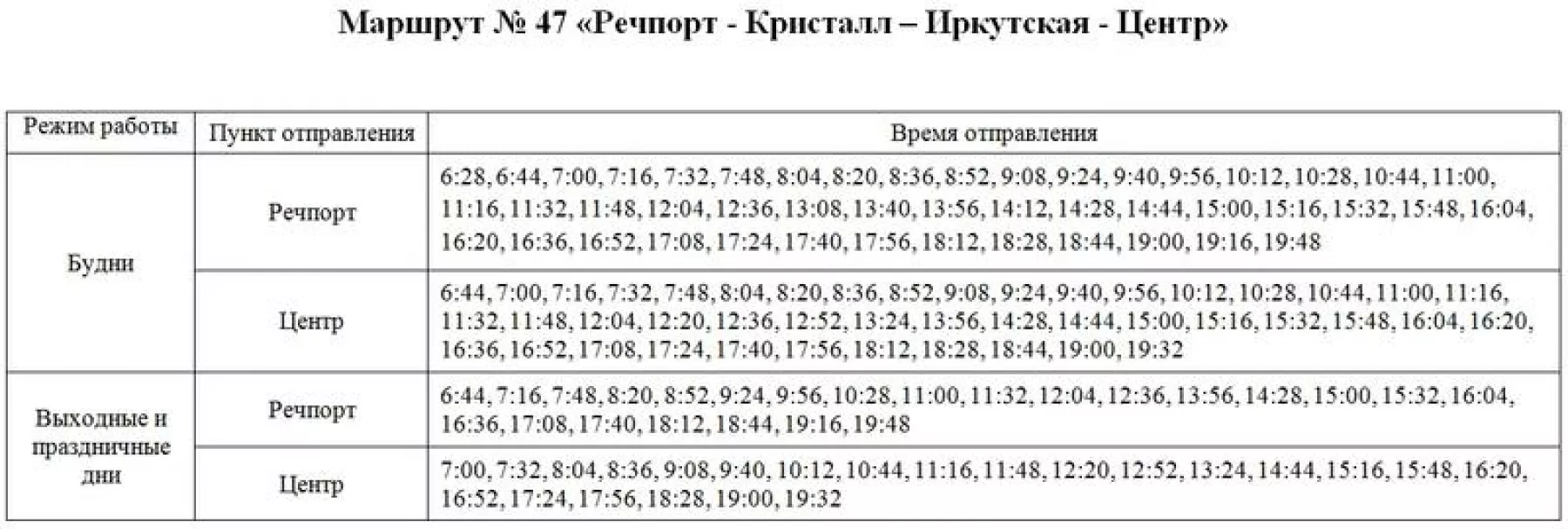 «Уважаемые пассажиры! С 1 апреля 2019 года вносятся изменения в расписание по маршруту № 47 «Речпорт – Иркутская – Центр»: сокращается количество выходов до 6 в будни и 3 выхода в выходные и праздничные дни (четные)», - говорится в сообщении.