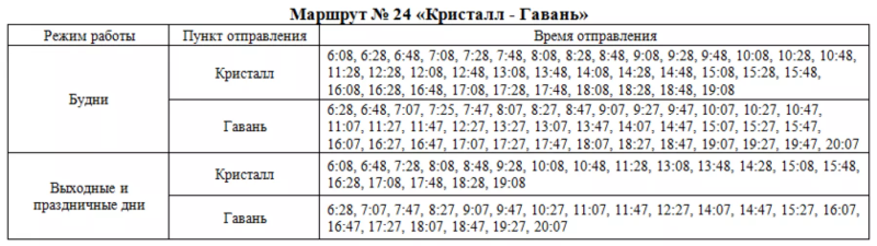 Теперь в воскресенье и праздничные дни автобусы по маршруту № 24 «Кристалл-Гавань» будут ходить реже. Интервал движения увеличится до 40 минут.
