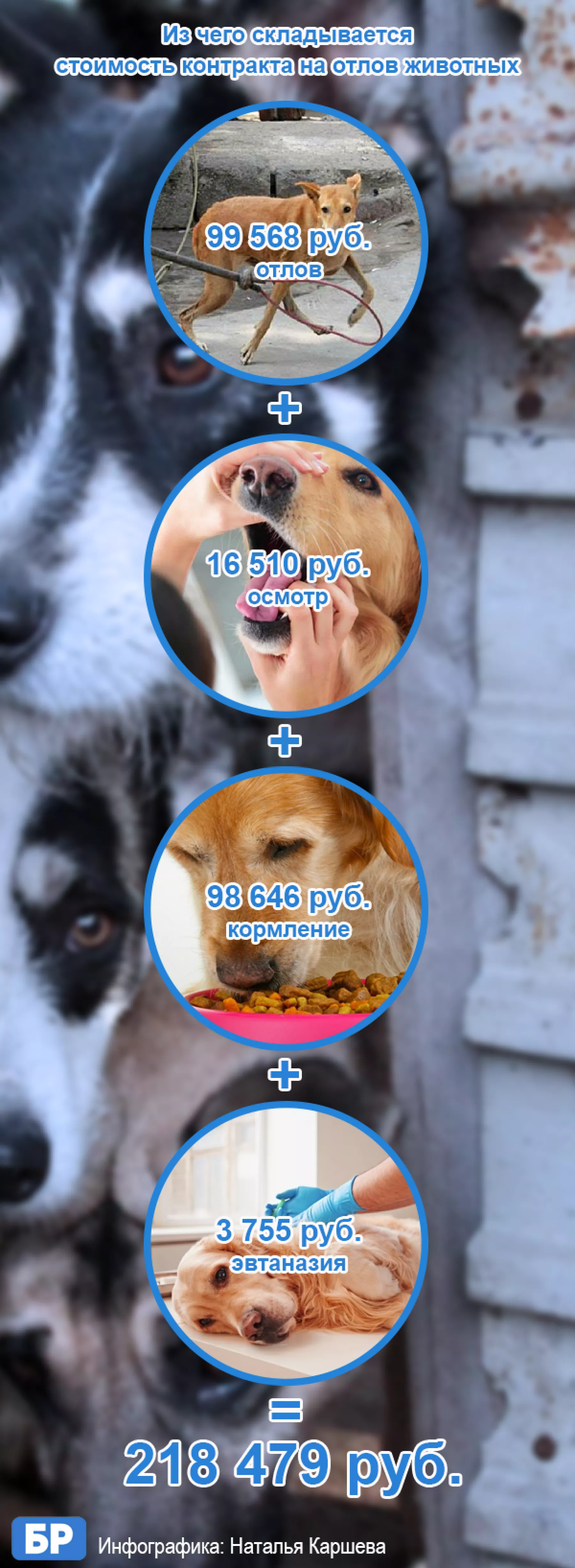 Так и на сей раз. Есть свои планы. Так, в техзадании указано, что отловить нужно 254 животных. Если быть более точными, в самих бумагах их считают «по головам». Так и написано: 254 головы. При этом содержание в специально отведенных помещениях для безнадзорных «голов» с кормлением обходится в 430 руб. за 10 дней. В 65 руб. оценен осмотр ветеринаром каждого пойманного животного. Дальше - приговор: жить собачонке или кошке или нет. На эвтаназию, попросту – усыпление, своя разнарядка. Так, в контракте учтено, что усыпить могут 25 крупных собак (в случае признания животного агрессивным или больным) и 10 мелких. Цена лишения жизни - невелика: 125 рублей за крупное животное и 63 – за мелкое.