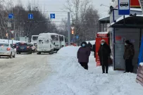Городские дороги, тротуары и автобусные карманы замело снегом.