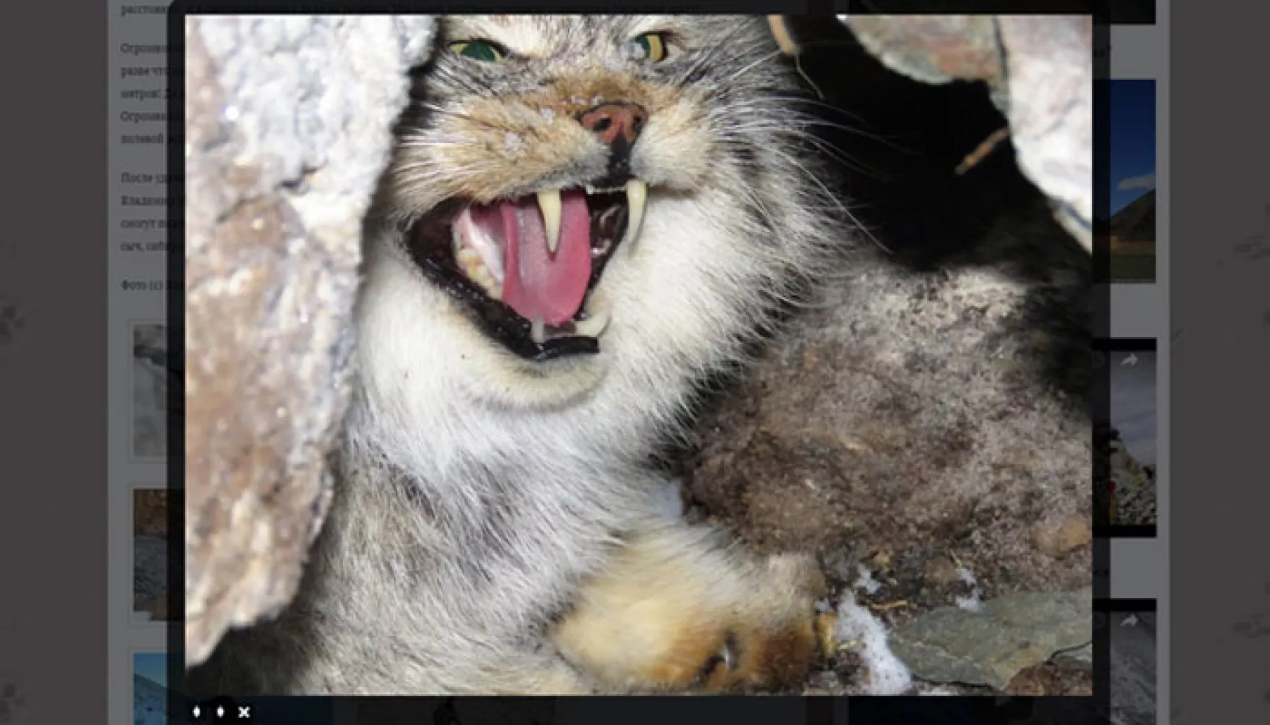 Выманить кота из норы удалось через полчаса, когда фотографы отошли на несколько метров. Обманутый манул выскочил из убежища и был застигнут врасплох щелчками камер. Селфи с котом не получилось – манул продемонстрировал свои зубы, разрешив снимать только с расстояния. Терпеливо переждав незапланированную фотосессию, животное покинуло место встречи.