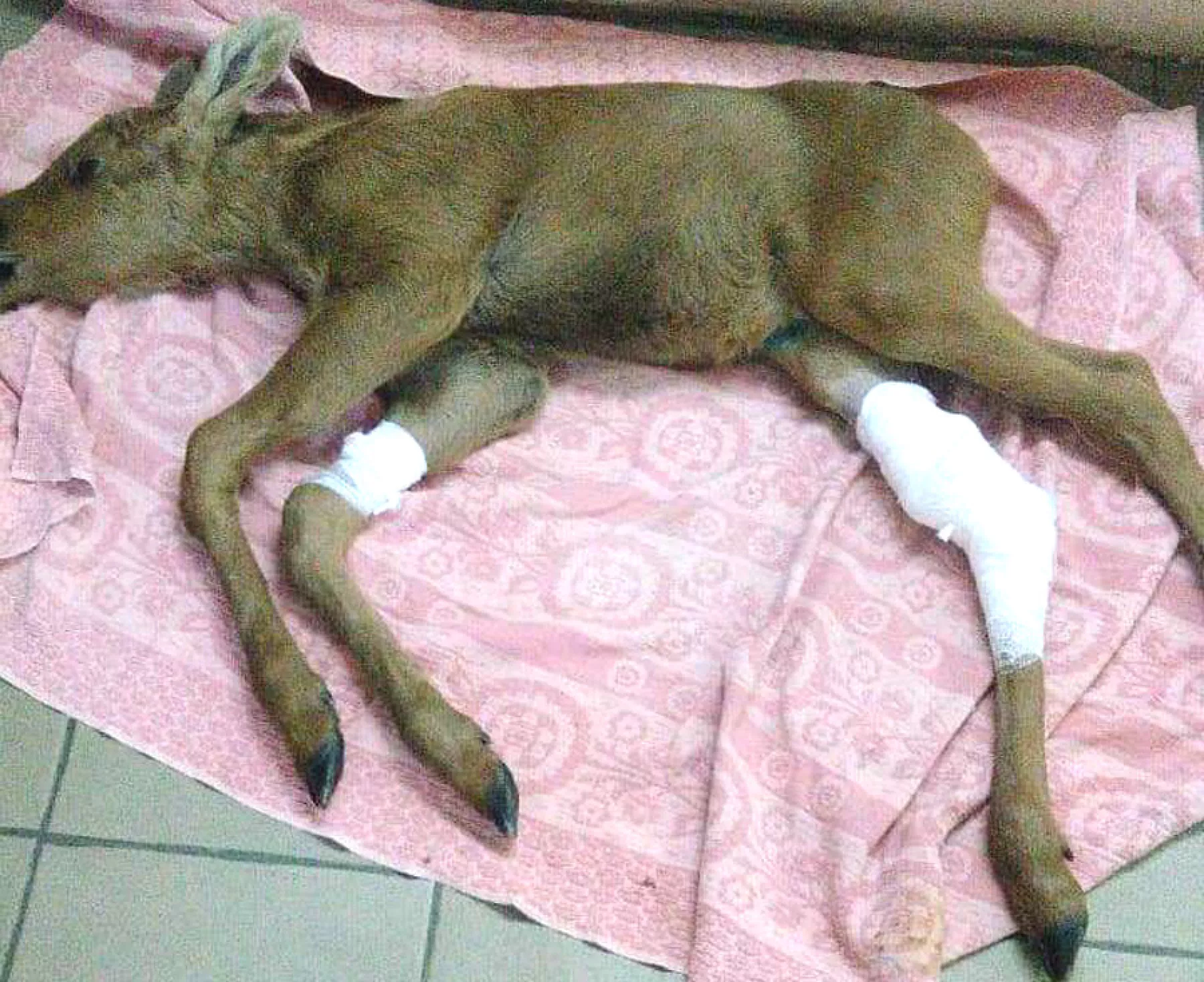 На месте врач осмотрел пострадавшее животное. Выяснилось, что у лосенка, который находился в тяжелом состоянии, была сломана задняя нога. На лечение его доставили в Центр спасения диких животных «Ноев Ковчег», где и прооперировали. Операция длилась 4 часа, дело в том, что специалистам пришлось даже сделать подращивание кости.