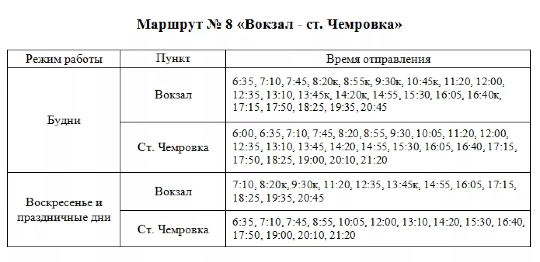 «Уважаемые пассажиры! С 14 апреля по маршруту № 8 «Вокзал - ст. Чемровка» в воскресенье и праздничные дни возобновляется рейс на 7.10 со ст. Чемровка», - говорится в сообщении.