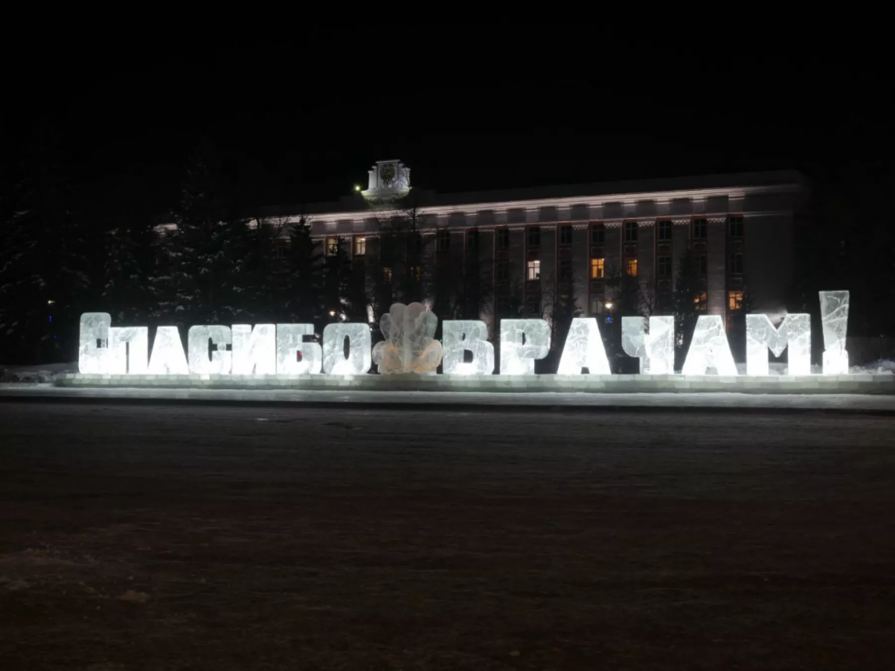 - В центре Барнаула завершился монтаж ледовой композиции, созданной по инициативе администрации города. Новый арт-объект «Спасибо врачам!» установлен на площади Советов рядом с памятником Ленину. Над созданием ледовой композиции трудились художники и резчики - бригада из пяти мастеров не прекращала работу даже в экстремально морозные дни.