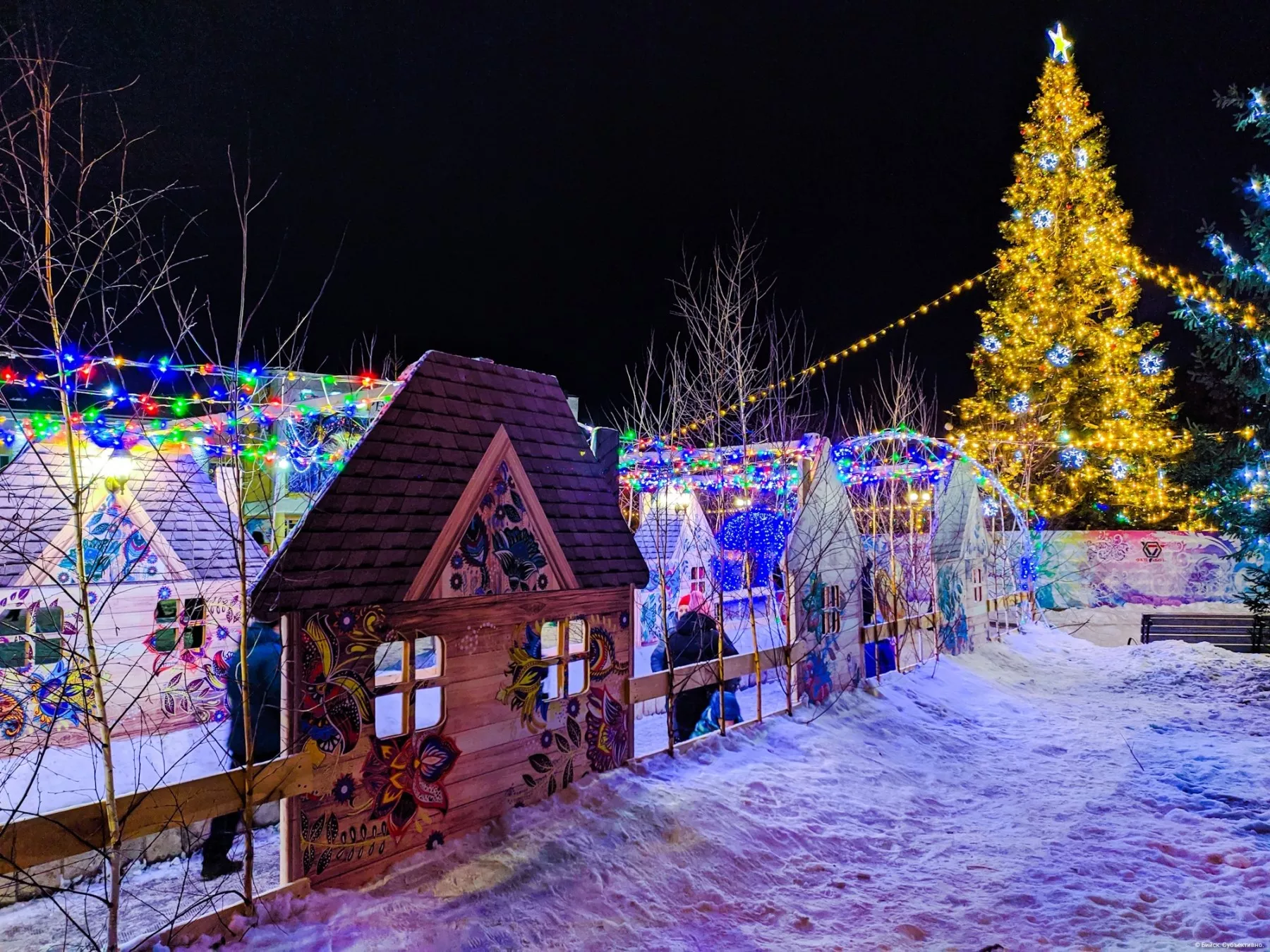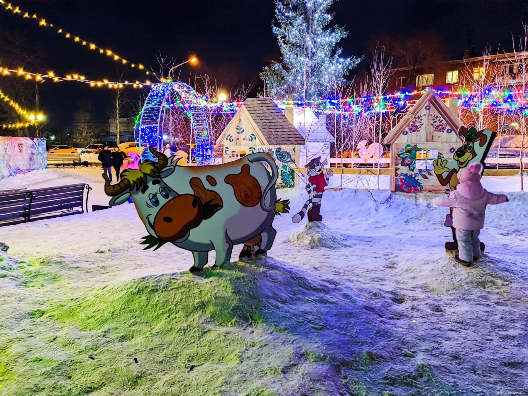 - В Бийске зажег огни новогодний городок у ДК БОЗ. Кроме красавицы елки и гирлянд, на площади у дворца появились стильные деревянные фигуры - расписные дома и персонажи любимых мультфильмов.