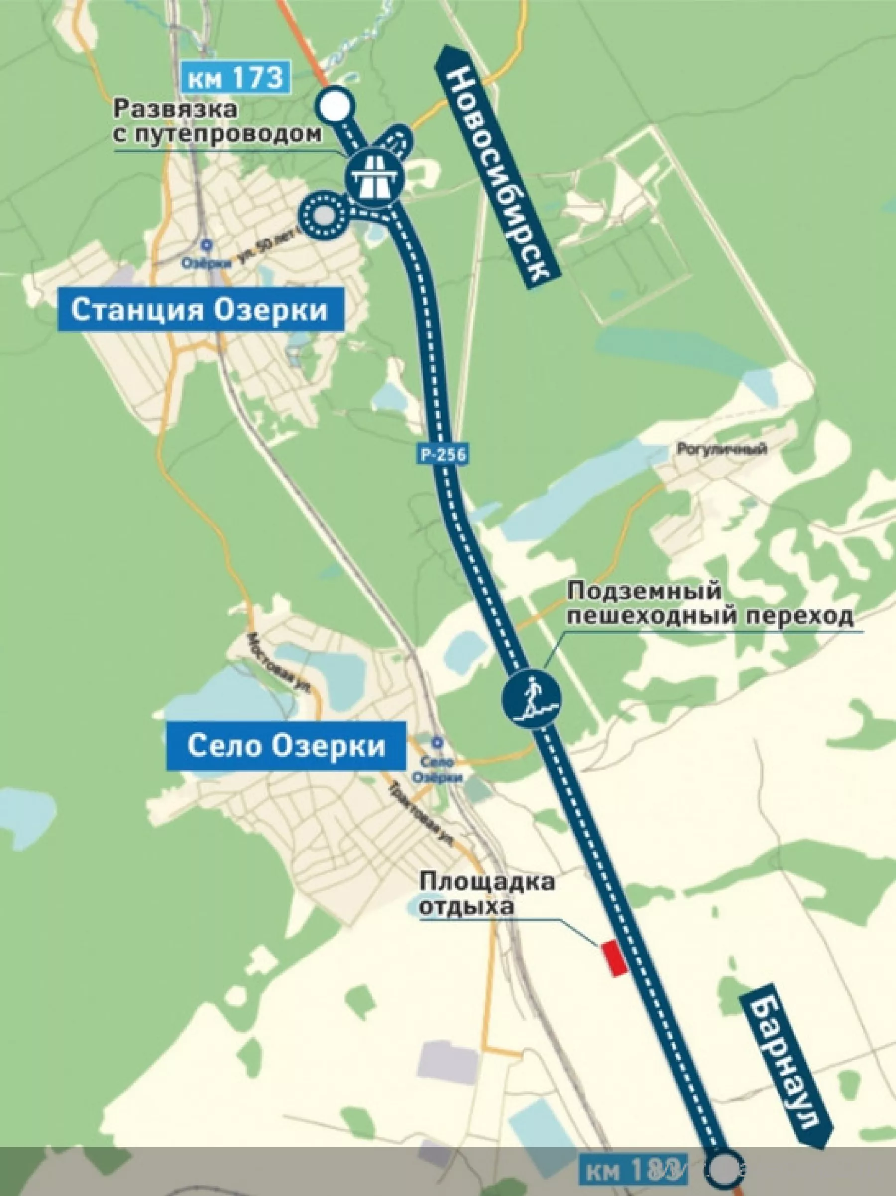 - Это будет четырехполосная дорога первой категории с разделительным барьерным ограждением. Возле станции Озерки построят двухуровневую транспортную развязку, которая обеспечит жителям ближайших населенных пунктов безопасный и комфортный выезд на федеральную трассу. Также проект включает подземный пешеходный переход возле села Озерки, строительство новых автобусных остановок, пешеходных дорожек и тротуаров, установку шумозащитных экранов, освещения, - сообщают в Управлении федеральных автомобильных дорог «Алтай».