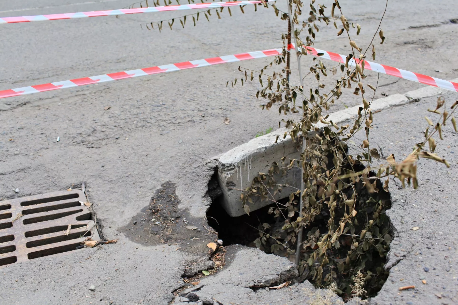Фото было сделано нашим фотокором Сергеем Кулыгиным. Видно, что провал обнесли ограждающими лентами, и он немаленький. Инцидент произошел сразу после сильного дождя, который случился в ночь на пятницу, 4 сентября. Когда будет отремонтирован провал, пока не сообщается.