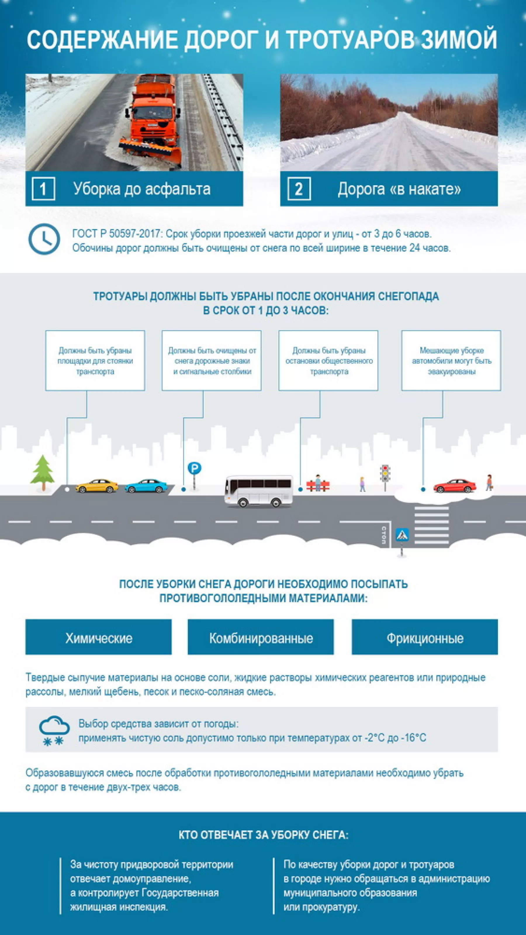 По ГОСТу, проезжую часть дорог и улиц должны очищать от снега и льда за 3 - 6 часов. Во время на проезжей части может находиться рыхлый или талый снег толщиной от 1 до