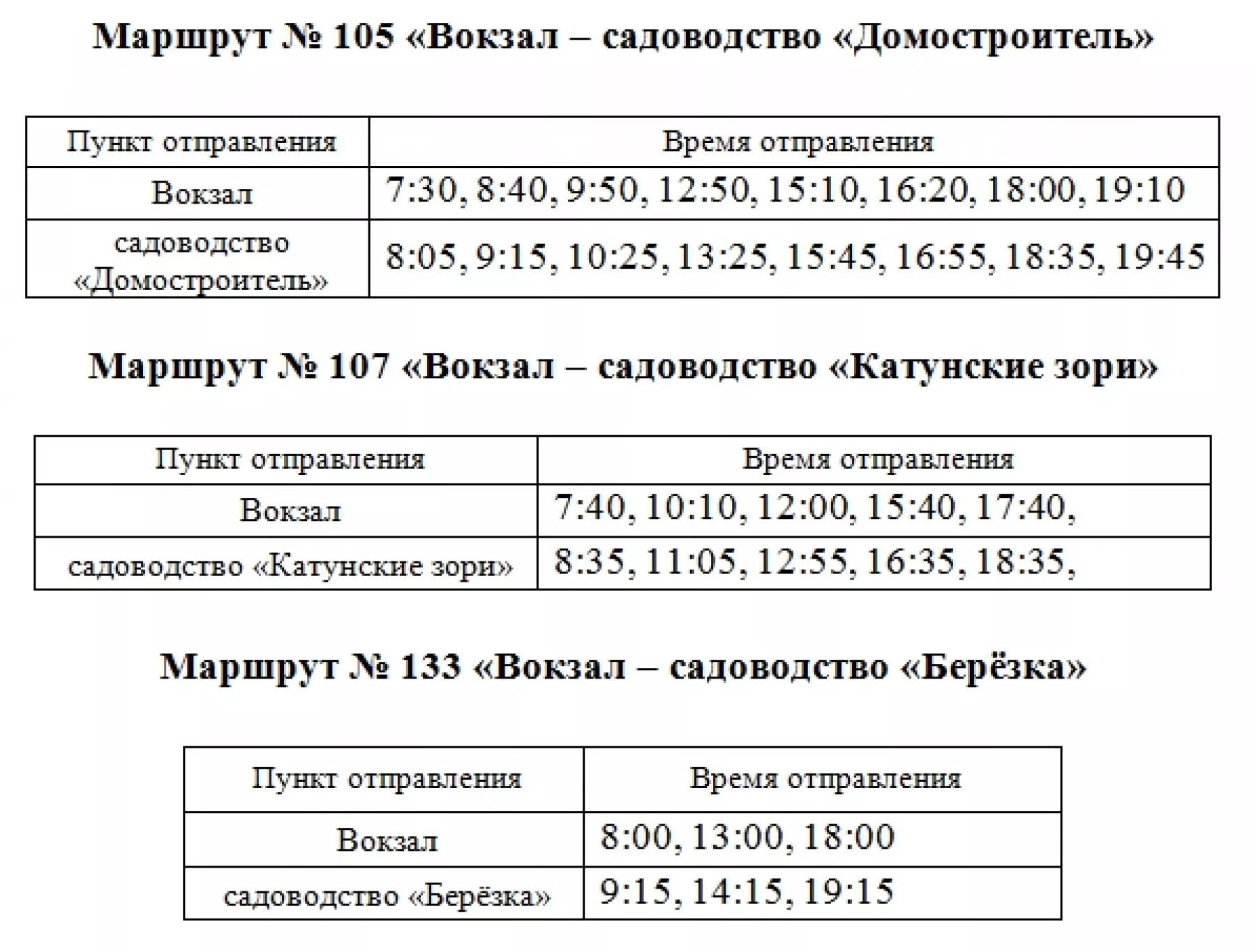С 1 июля в расписание садоводческих маршрутов № 105, 107 и 133 вносятся изменения, информирует пассажиров «Бийскгортранс».