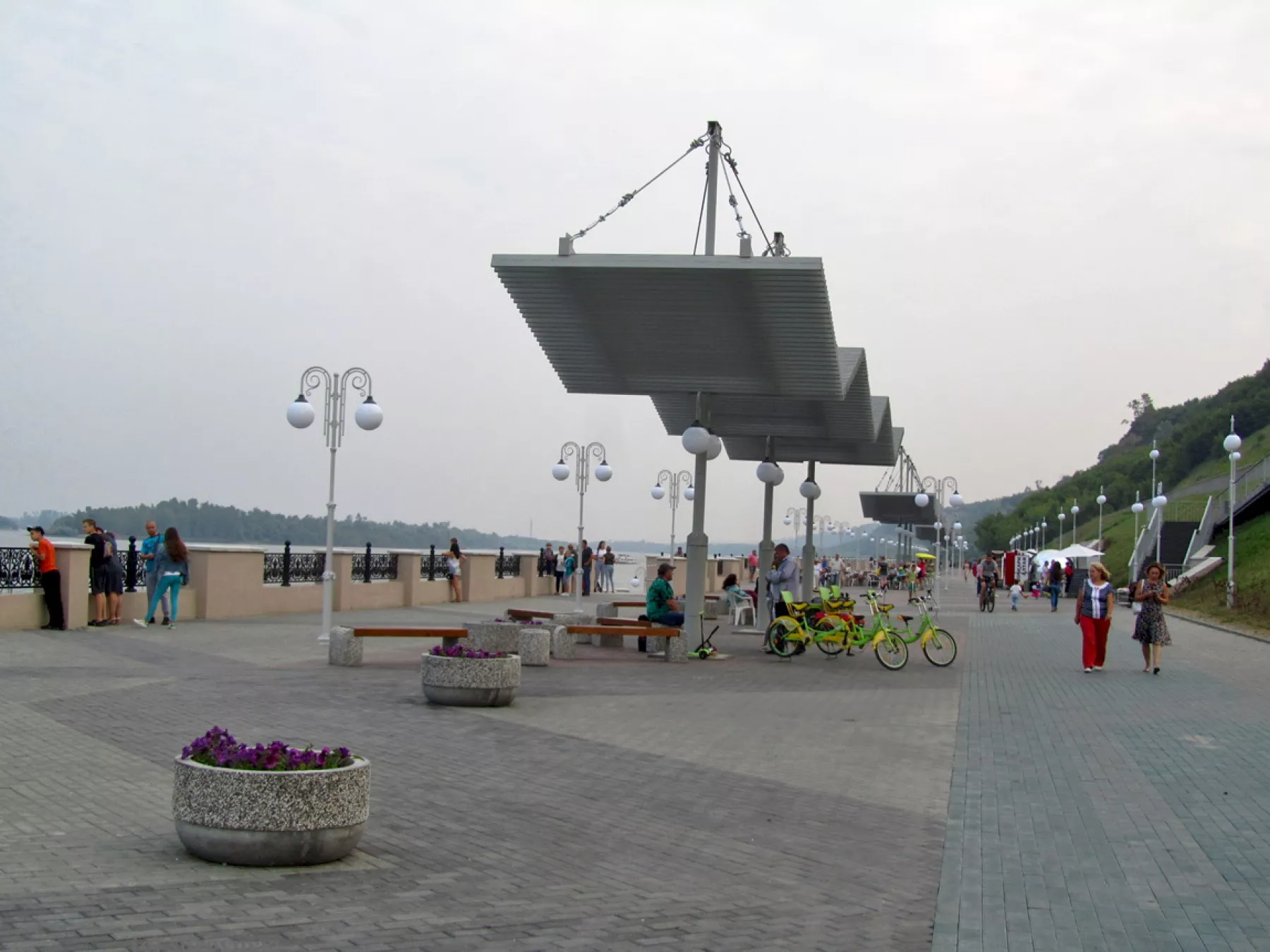 Спустившись со смотровой площадки Нагорного парка вправо, можно увидеть огромные буквы «БАРНАУЛ» и берег Оби, а еще набережную. Да, в отличие от Бийска, она тут есть. Прогулочная зона, протяженностью 514 метров, приспособлена для спокойного отдыха, прогулок и проведения городских мероприятий. Здесь установлен теневой навес, скамейки, амфитеатр, общепит.