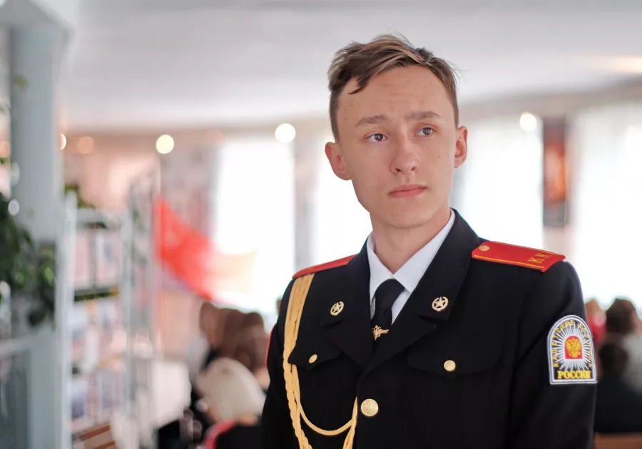 Отрывок из стихотворения Константина Симонова «Сын артиллериста» на конкурсе прочитал Максим Дягтерев, ученик 9-го класса кадетской школы. Это поэма о судьбе молодого лейтенанта, совершившего подвиг. Источником сюжета стала реальная история двух товарищей-офицеров.