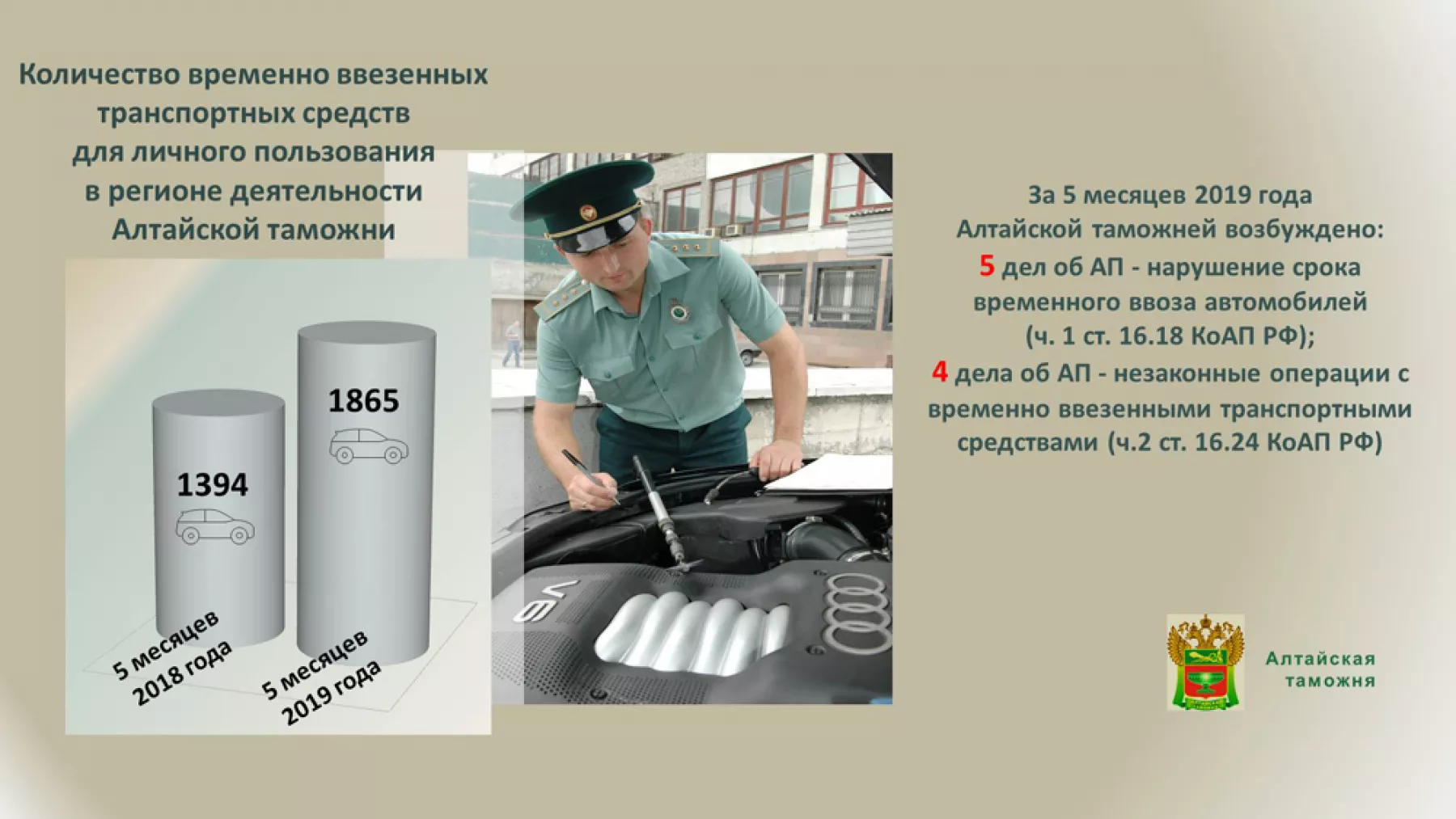Только с начала 2019 года Алтайской таможней возбуждено было пять административных дел за нарушение срока временного ввоза автомобилей. Сумма подлежащих уплате таможенных платежей составила 4,6 млн руб.