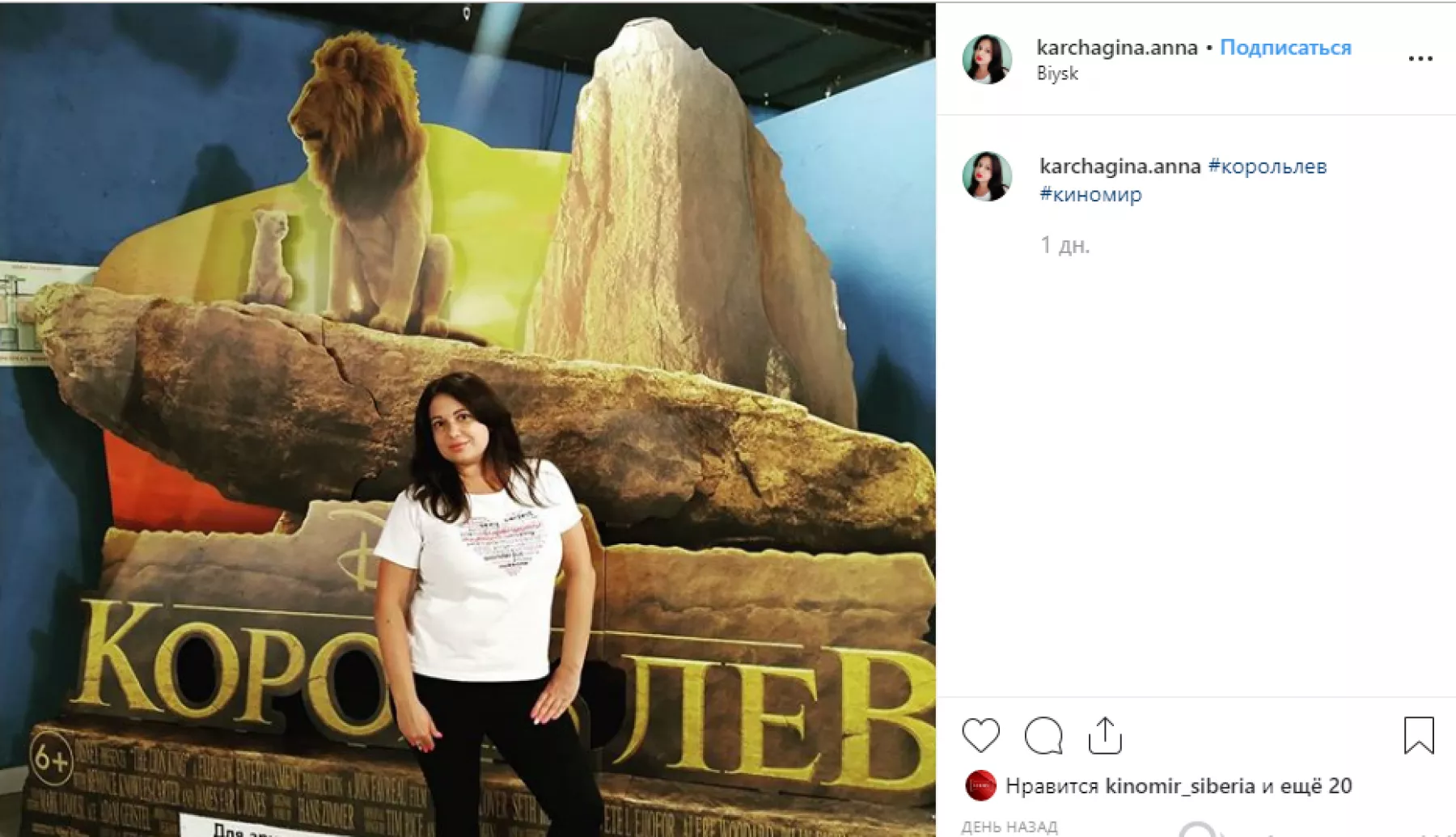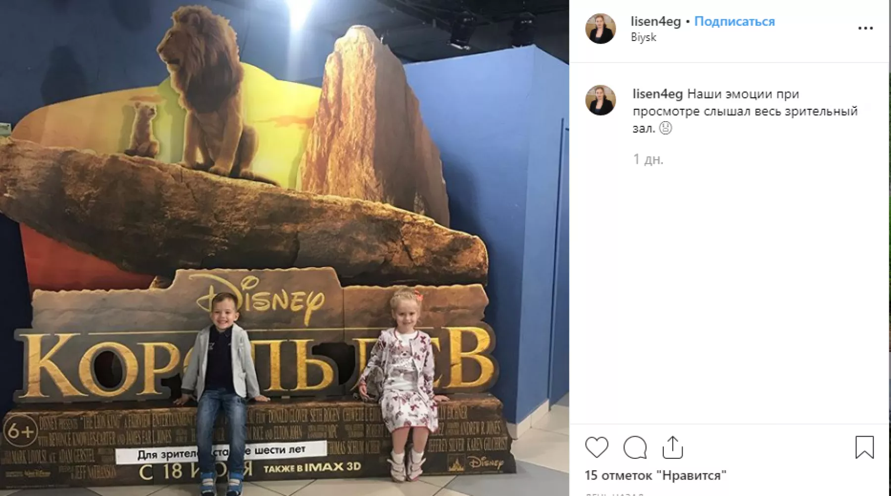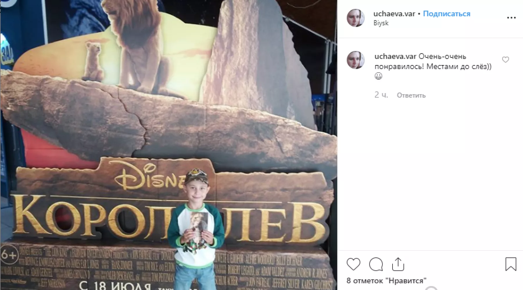 Кажется, на выходные половина города побывала в кинотеатрах на масштабной премьере ремейка «Короля Льва». Соцсети переполнены фотографиями с рекламными постерами фильма. Причем, бийчане фотографировали у афиш не только маленьких детей, но и с удовольствием делали селфи. Многие пишут в отзывах, что «рыдали как в детстве, но фильм – просто чудо!».